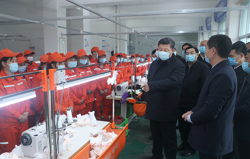 安康市地处秦巴山区集中连片特困地区的核心区。21日上午,习近平来到安康市平利县老县镇锦屏社区。锦屏社区累计安置搬迁贫困群众1346户4173人。习近平实地察看了社区电子加工厂、毛绒玩具厂、服饰公司产品展示厅,对当地“山上兴产业,山下建社区,社区办工厂”的发展思路给予肯定,勉励企业努力克服疫情带来的不利影响,积极拓展国内市场。习近平强调,今年是脱贫攻坚决战决胜之年,解决好贫困群众就业问题非常重要。各级党委和政府要加大扶持力度,通过各种方法保障贫困群众就业。镇上的群众听说总书记来了,纷纷来到街上,高声向总书记问好。习近平祝乡亲们幸福安康!