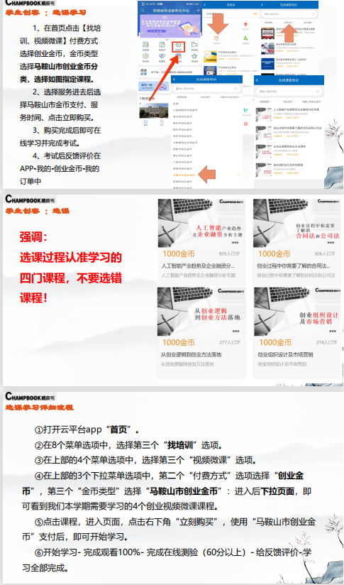 4.申请的马鞍山市创业金币应选择以下4个创业视频微课的课程:人工智能产业趋势及企业融资分析专题、创业过程中你需要了解的合同法和公司法、从创业逻辑到创业方法落地、创业组织设计及市场营销。