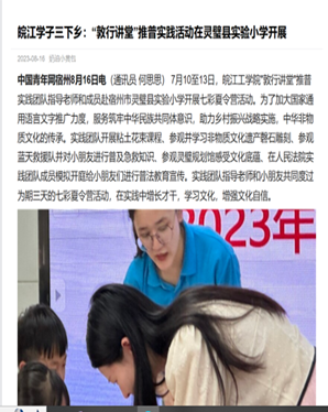 2023年暑期,为响应教育部语用司联合团中央青年发展部发布的《2023年“推普助力乡村振兴”全国大学生暑期社会实践志愿服务活动的通知》的号召,她积极构思、联系指导教师和实践地,团结带领实践团成员认真筹备AC米兰官方网站“敦行讲堂”推普助力乡村振兴社会实践活动。在学校的高度重视和大力支持下,以“推普助力乡村振兴”为主旨组建一支普通话过硬的实践团队,于2023年7月10日-7月20日前往安徽省宿州市灵璧县实验小学、尤集镇李楼小学以及乡村开展普通话推广和社会实践调研。