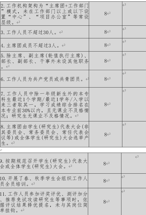| 1 | 主席团 | 5 | 统筹会内各项事务,统一协调分配任务。集中正确意见,制订学生会工作计划,并认真执行。带领全体会员干部做好自我管理工作,指导各部开展工作。定期主持召开学生会常委会会议,研究每一时段工作进展,分析情况,落实措施。及时总结好的工作经验,推广先进经验,表扬优秀干部。 |