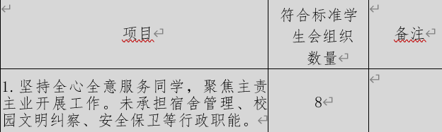| 7 | 维权服务部 | 8 | 通过维权机制开展问题收集、调查研究、协调解决等工作;协调学代会期间的代表提案工作;协助大学生一站式服务中心做好维护失物招领平台工作;主动解决涉及大学生利益的校园事件或校园问题;根据广大同学的利益诉求,提供各类生活服务。 |