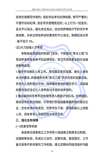 C4.深化“青马工程”,引导青年政治骨干坚定理想信念,深入基层学习锻炼,学员中学生团干部占比60%以上。 | 4 | 是/否 | 是 | ①校级“青马工程”学员404人,其中学生团干部351人; ②校级“青马工程”学员(√是/£否)面向全校公示; ③校学生会主席团成员(√是/£否)为校“青马工程”当然人选; ④“青马工程”(√是/£否)覆盖到院系; ⑤院系“青马工程”学员640人,其中学生团干部450人; ⑥院学生会主席团成员(√是/£否)为院“青马工程”当然人选; ⑦全校学生团干部共1743人; ⑧违规违纪学员(√是/£否)有退出机制。 |