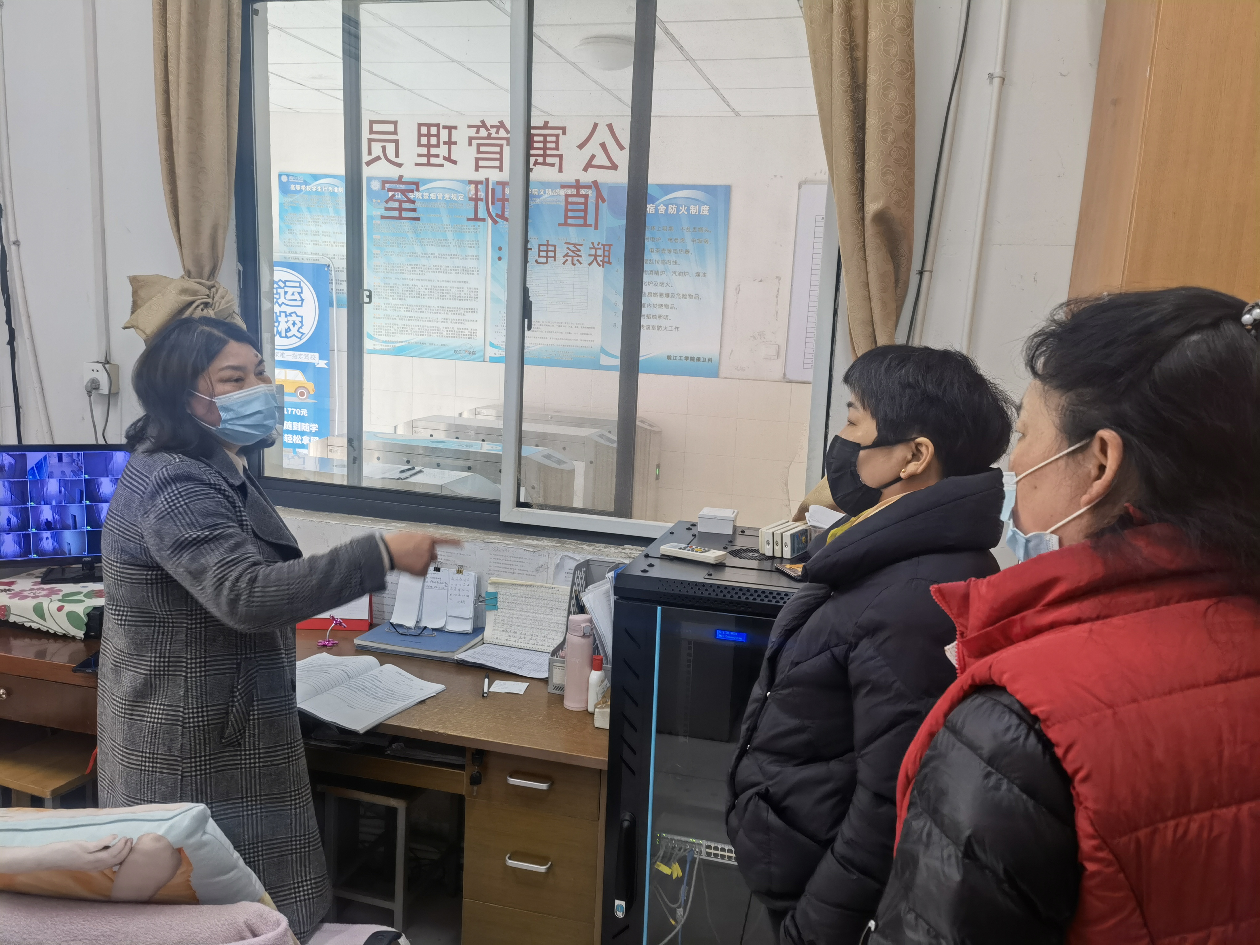 朱建芬一行依次检查了各个宿舍楼的内外部公共区域卫生状况,检查了每位宿舍管理员的工作台账和相关工作记录,并在现场就如何加强疫情期间宿舍卫生安全管理工作进行指导。