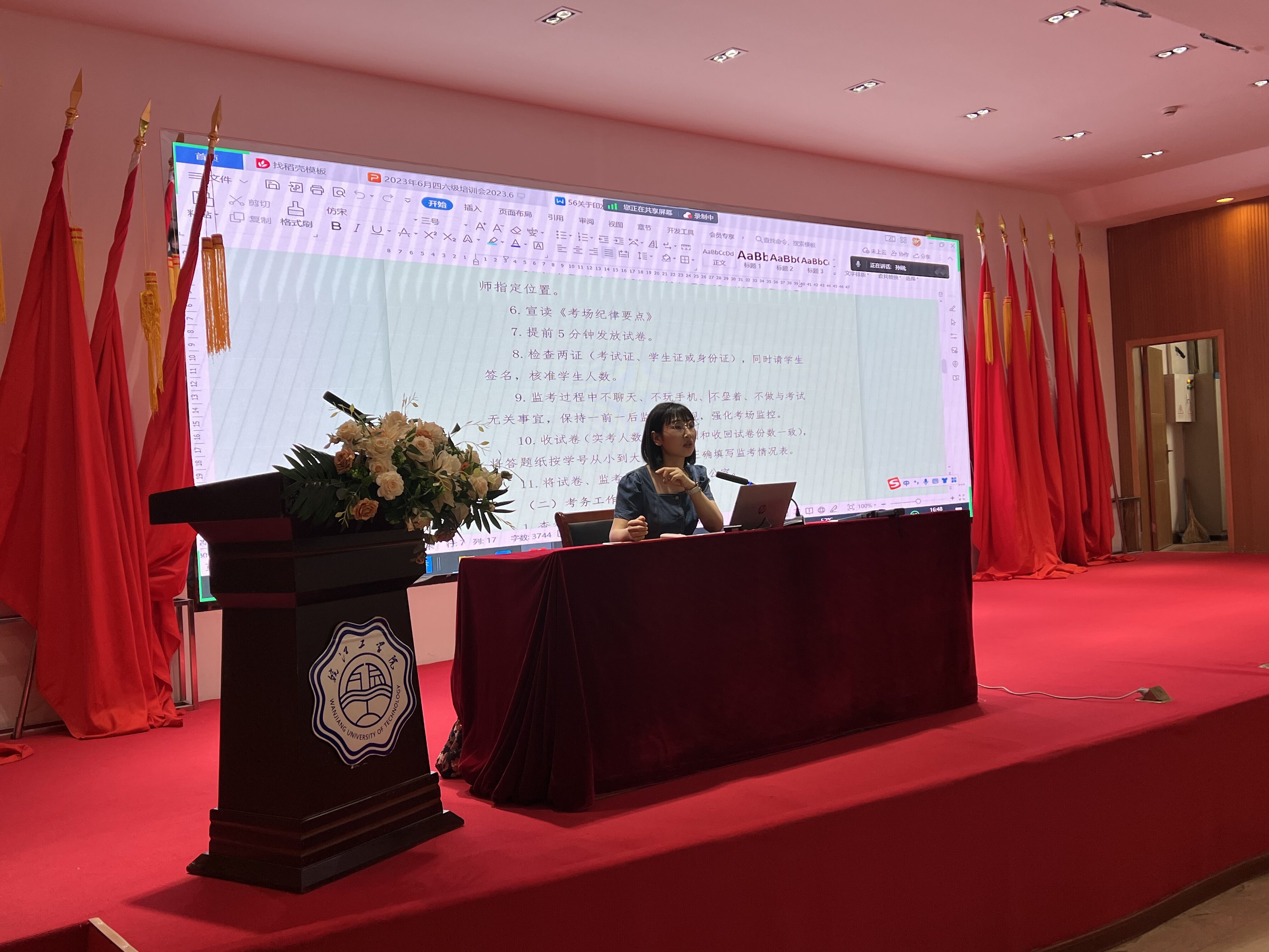 孙娴就此次米兰四六级考试的报考情况和考场安排布置进行介绍。她从考试时间安排、考试前准备及要求、考试题型结构及材料介绍、考试进程及操作要点、试卷的封装及验收、监考职责、违规的认定和处理等方面进行全面讲解,要求监考老师明确考试各个环节,提醒考生做好考试准备,带好考试所需的相关物品, 顺利完成监考任务。