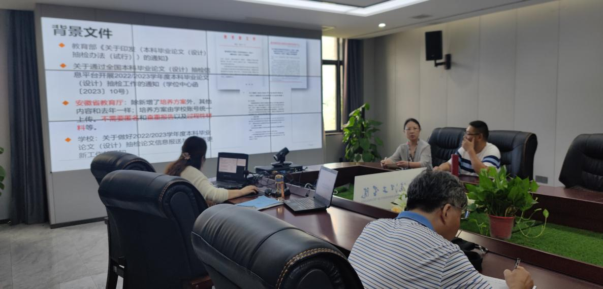 根据教育部学位与研究生教育发展中心《关于通过全国本科毕业论文(设计)抽检信息平台开展2022/2023学年度本科毕业论文(设计)抽检工作的通知》(学位中心函【2023】10号)、安徽省教育厅督导办的相关通知要求,为做好米兰2022/2023学年度本科毕业论文(设计)抽检论文信息报送与专家库更新工作,9月4号上午,教务部部长江冰、副部长葛文生、各学院教学副院长(助理)、教学科研办主任及教务部相关负责人在F417召开毕业论文(设计)抽检工作动员会。