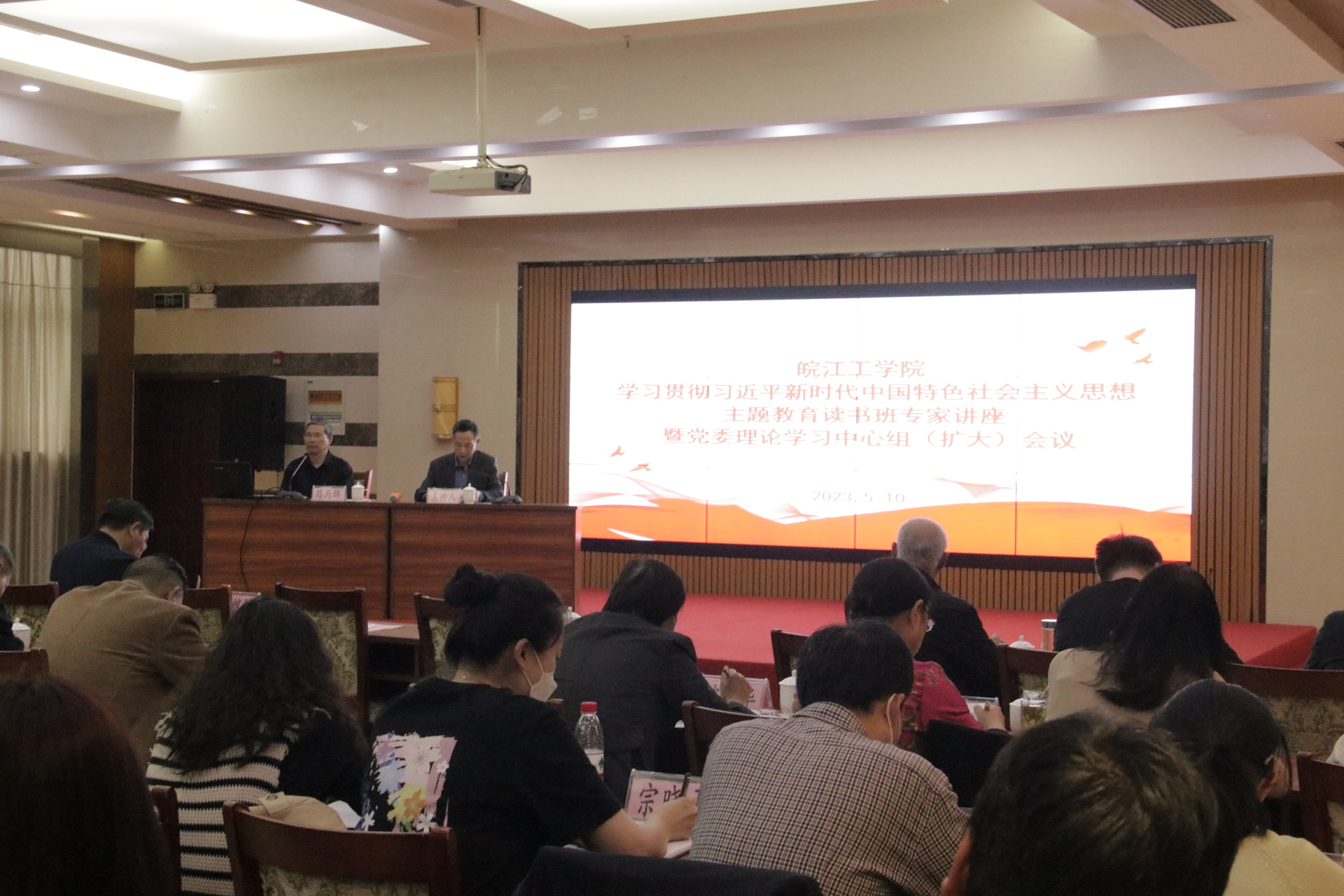 5月10日下午,学校在文海宾馆多功能厅举办主题教育读书班专家辅导暨党委理论学习中心组(扩大)学习会。党委书记丁家云主持会议并讲话,学校中层以上领导干部、党支部书记、马克思主义学院全体教师参加。党的二十大代表、安徽师范大学马克思主义学院教授、博士研究生导师路丙辉以“高举旗帜、团结奋斗、勇毅前行――党的二十大精神学习体会”为主题,深入浅出的对党的二十大报告进行了系统讲解和阐释。