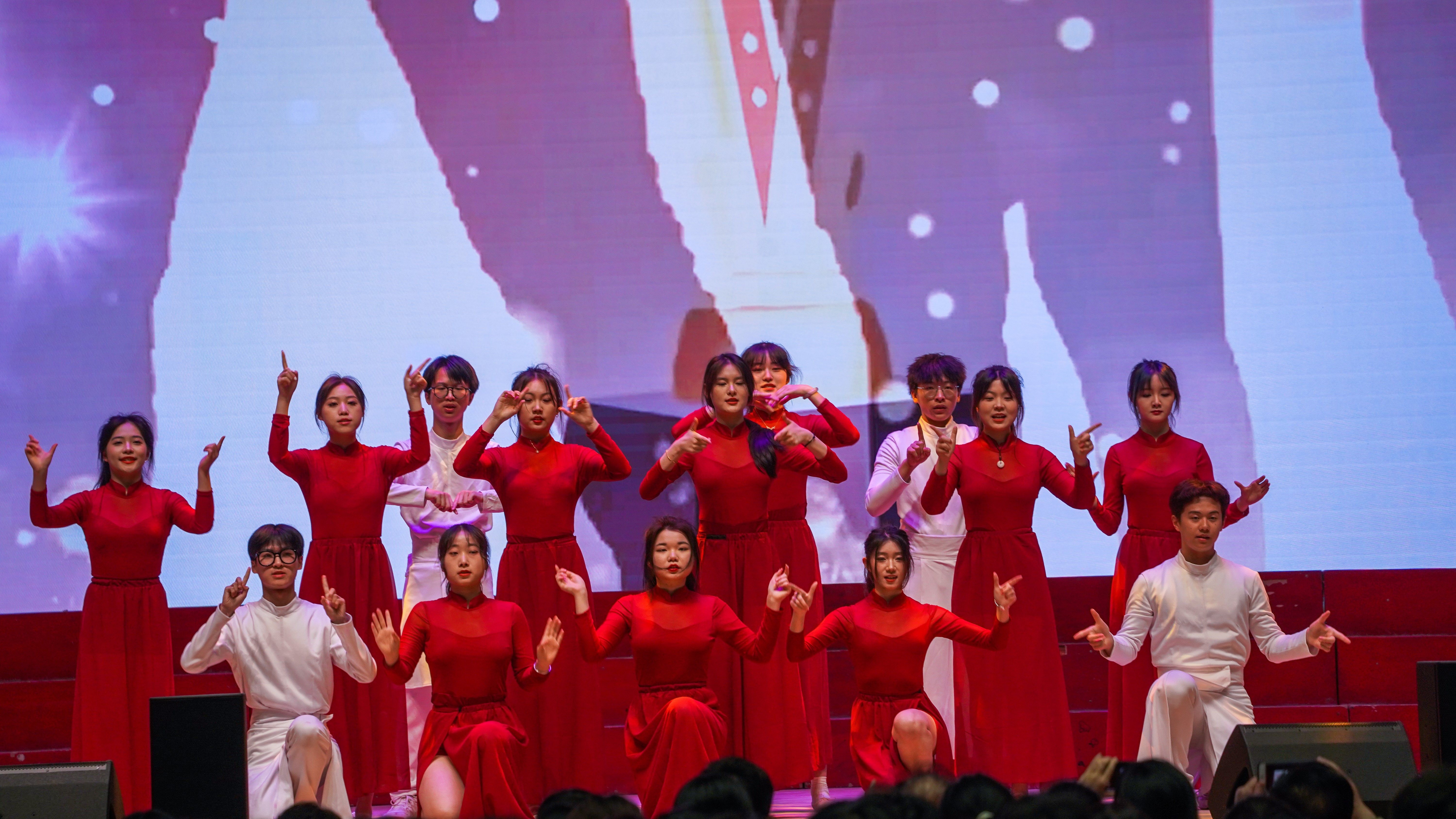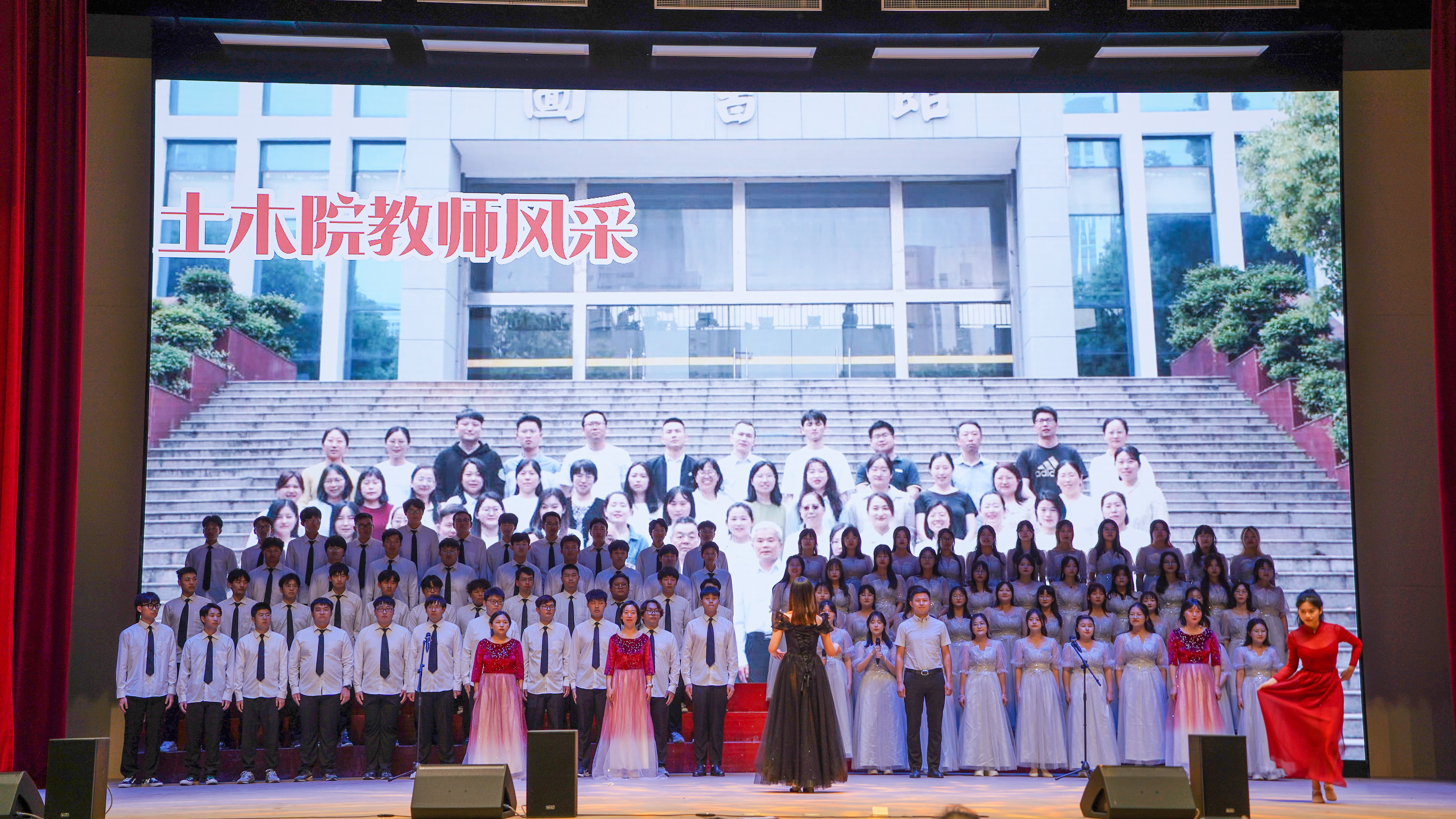 机械工程学院代表队演唱的《党旗飘扬的方向》气势雄伟,拉开了大合唱的帷幕。比赛中,师生们以饱满的激情、嘹亮的歌声深情演绎了《有我》《当那一天来临》《今天是你的生日》《一起向未来》《我和我的祖国》《不忘初心》等振奋人心、催人上进的红色歌曲,以歌唱、舞蹈、击鼓等方式,展现在党的带领下伟大祖国翻天覆地的变化,更是慷慨激昂的表达出对祖国的热爱。最后,比赛在大学生艺术团舞蹈团的舞蹈《坚信爱会赢》中落下帷幕。