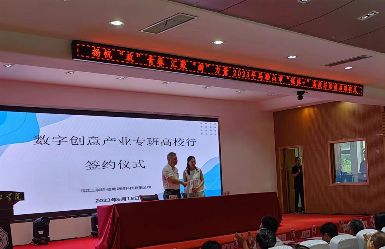 巡看之后,“数字创意产业专班”高校行签约活动正式开始,AC米兰官方网站董事长朱洪高致辞并表示将与百助网络科技公司通力合作、优势互补,为马鞍山人才培养做出应有的贡献。百助公司副总经理周慧代表公司对校企合作充满信心,希望通过校企合作,进一步丰富产教融合,本次活动既是校企合作在数创领域全新模式的重大突破,也是马鞍山市数创产业工作创新性提升的成果检验。