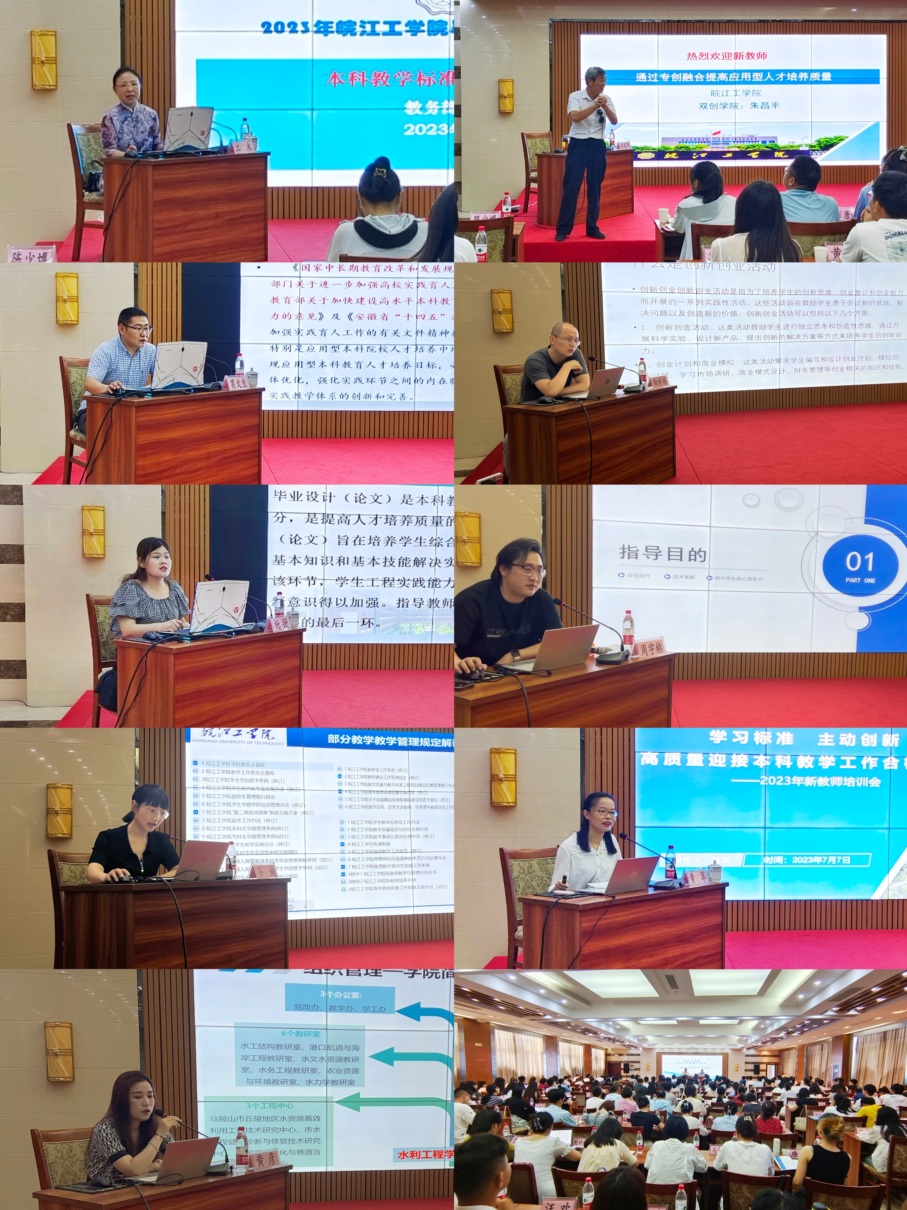 本次培训共有五场主题报告:第一场由教务部部长江冰作题为《教师课程教学规范(课程类)》报告;第二场由教务部副部长葛文生和实践科科长杨扬作题为《教师课程教学规范(实践类)》报告;第三场由教务部常务副部长孙娴和水利水电工程学院教学科研班主任黄彦作题为《教学档案材料归档管理规范》报告;第四场由双创学院院长朱昌平、院长助理陶彬彬和骨干教师周宇赫作题为《新教师如何参与创新创业指导工作》报告;第五场由评估办常务副主任黄翠作题为《新教师如何参与创新创业指导工作》报告。