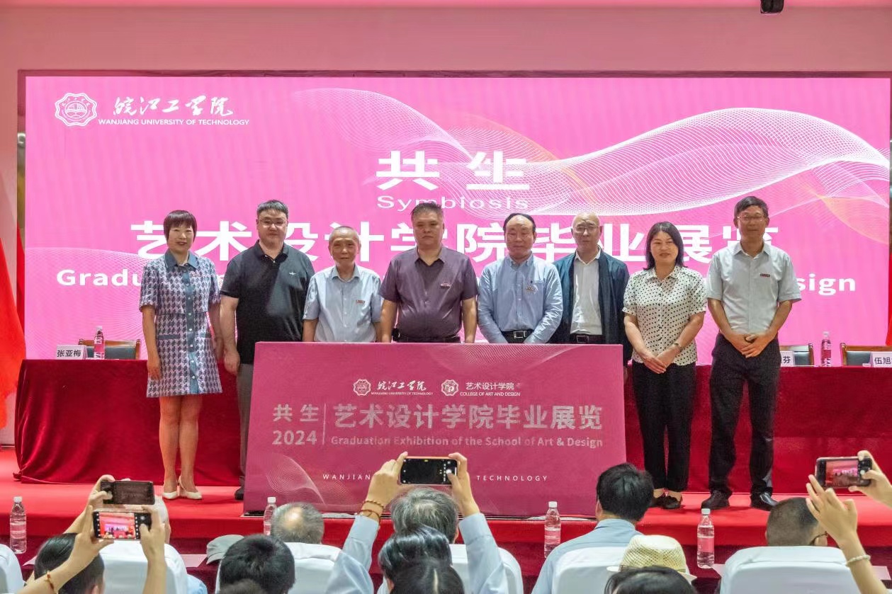 伍旭坤致开幕词,他指出,本届毕业展以“共生”为主题,汲取了《庄子》“天地与我并生,万物与我为一”的哲学智慧,体现了艺术设计学院对艺术与技术深度融合的追求,也折射了对人与环境和谐共处的哲学思考。本次毕业展共展出223件作品,实现了毕业生人人参展。这些作品是艺设学子们在各位指导教师的精心指导下,将专业知识与社会实践相融合的一次精彩呈现,其中大部分作品来源于生产一线,具有明显的实操性。同学们通过独特的视角和表达方式,引导大家深入思考数字化时代世界发生的新变化,生态文明时代人与自然和谐共生的新愿景。