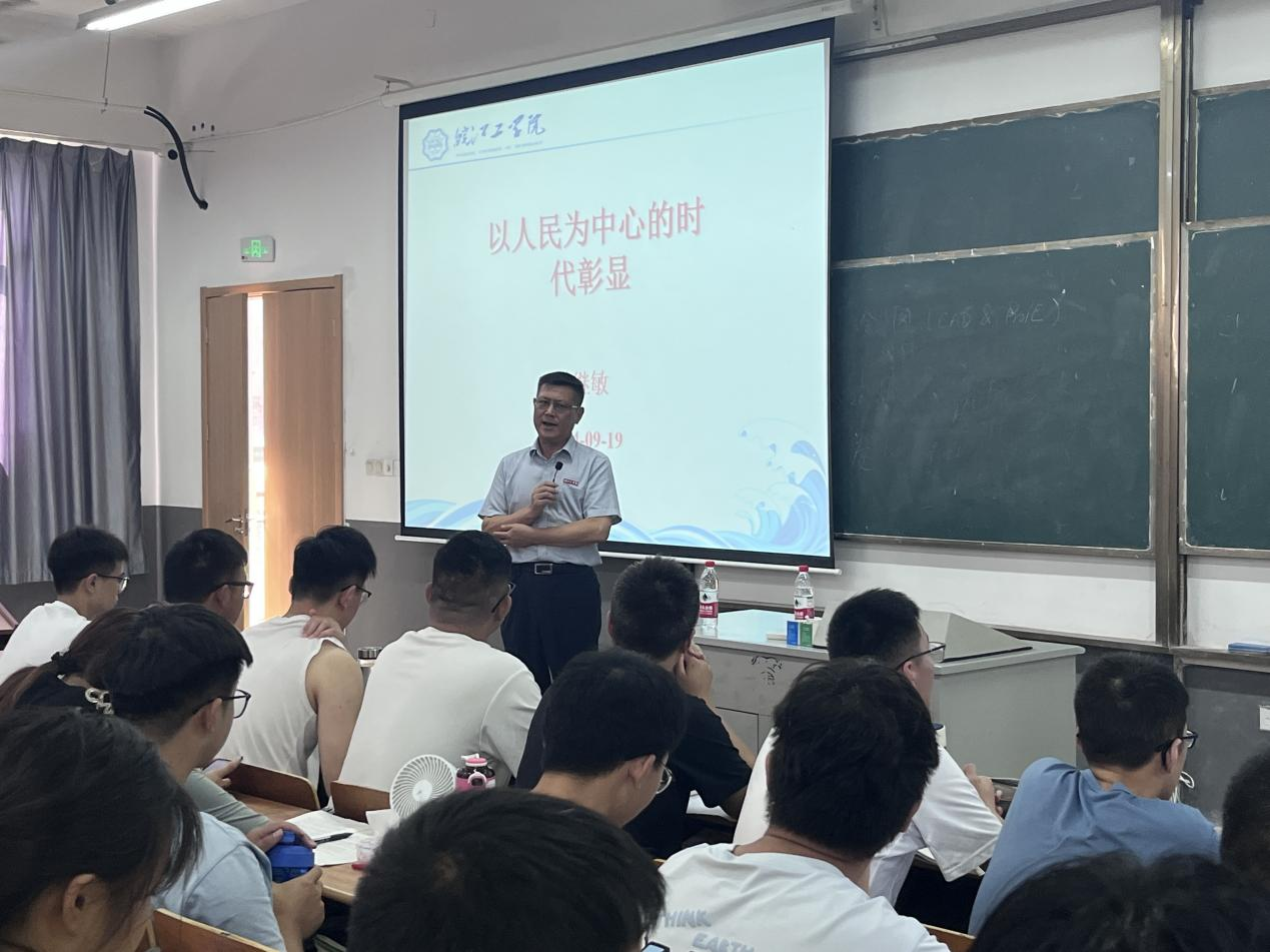 吴继敏以“以人民为中心的时代彰显”为主题,为21电气专业的同学们上一堂生动的思想政治理论课。他以人民为中心思想的发展脉络,系统讲授了“以人民为中心、党的不同时代的领导人、毛泽东与为人民服务、习近平与为人民服务、以人民为中心在高校”等教学重点。他表示,要树立群众路线、贯彻群众路线,将学生回归教育主体,教职工回归管理主体,一切以学生为本,关爱学生。