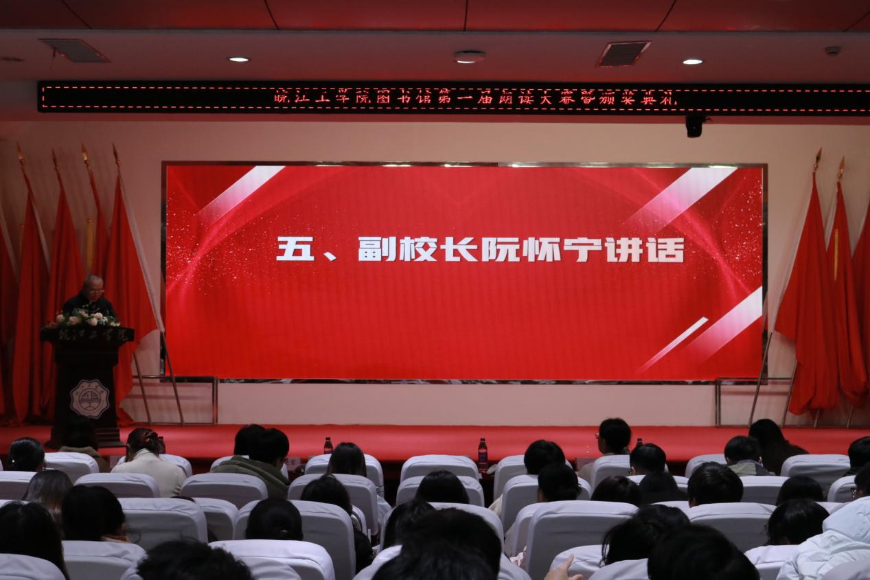12月18日下午,一场别开生面的朗读大赛活动在米兰霍里山校区图书馆报告厅圆满举行,众多师生齐聚一堂,共同见证了知识与声音交织的精彩时刻。副校长阮怀宁,教务部部长江冰,图书馆陈馆长,团委书记、学生工作部副部长尚贤燕,学生工作部副部长许戎,各二级学院分团委书记、图书馆全体工作人员、部分学生代表参加了活动。