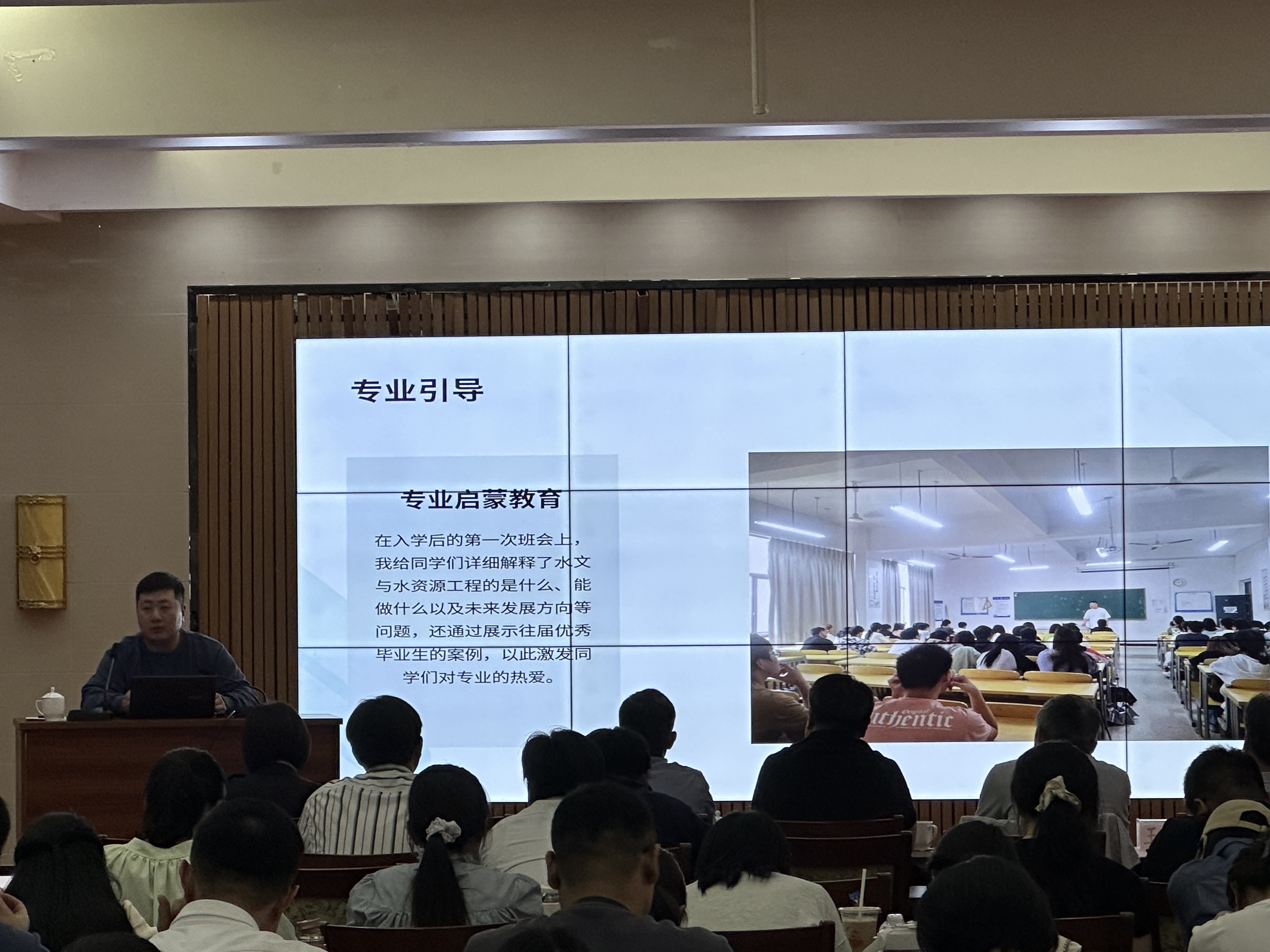 2022级水文1—3班班主任张金玺老师以 “同行一千天,共写成长篇”为主题,分年级构建育人体系:大一重专业启蒙与适应性引导,大二强化学科竞赛与心理健康教育,大三深化考研就业精准指导,实现“一生一策”个性化培养。2022级给排水1—3班班主任刘瑞琳老师从量化管理视角,汇报了学业辅导、主题班会、寝室走访等常规工作成效,并展示了“学生成长档案”“家校协同平台” 等精细化管理案例。