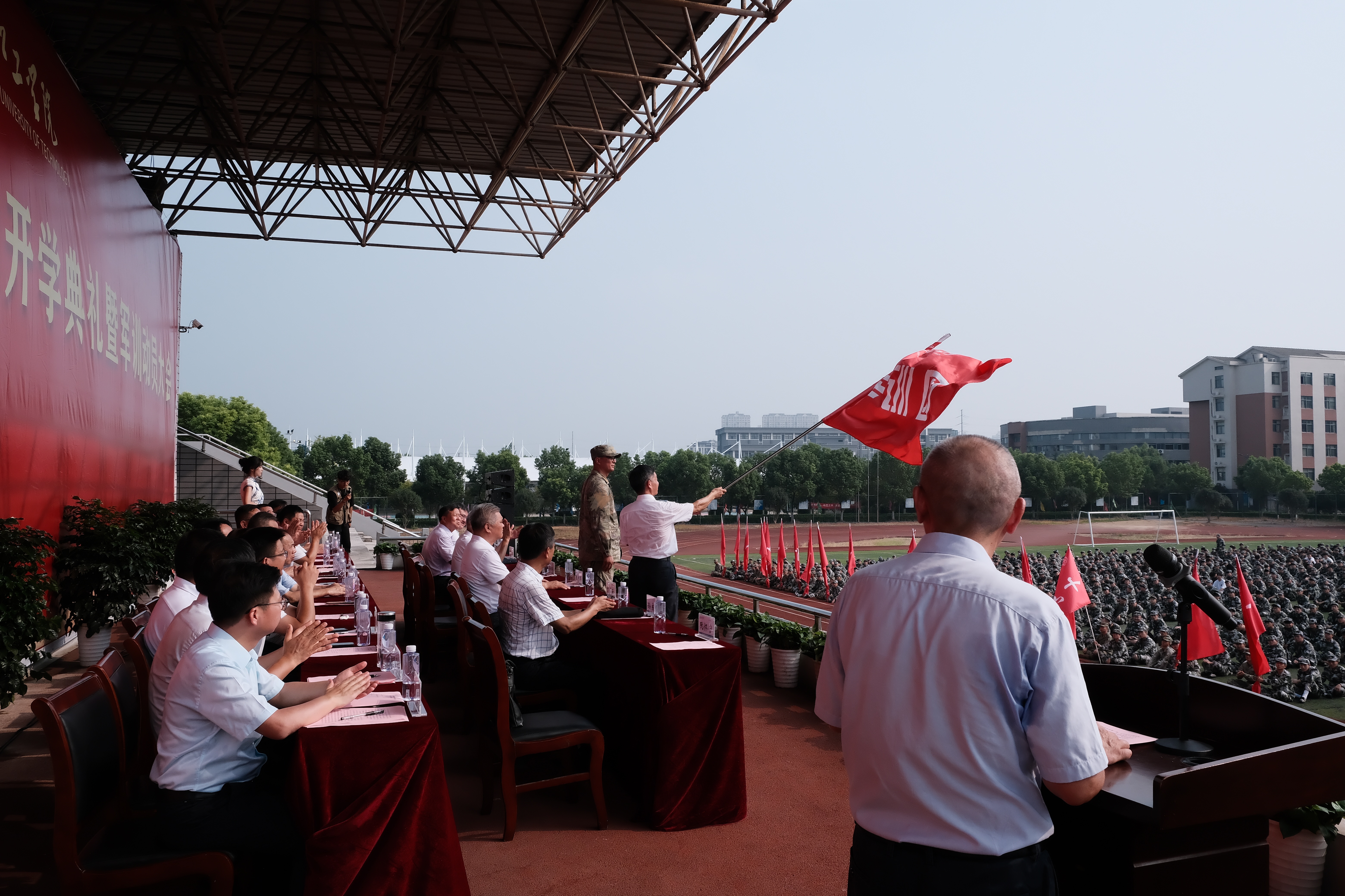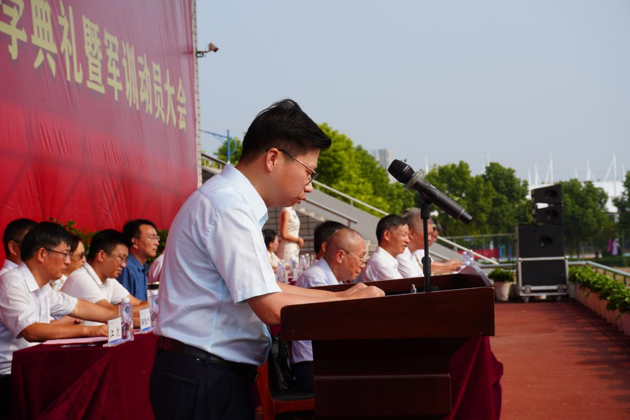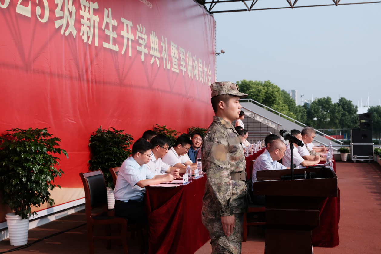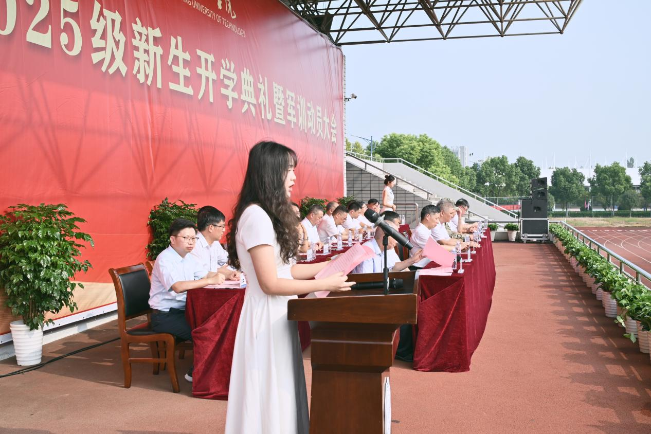 在军训动员阶段,侯进元宣读军训团成员名单,丁家云向军训部队授旗。迎风招展的红旗下,2025级新生开学典礼暨军训动员大会圆满结束。