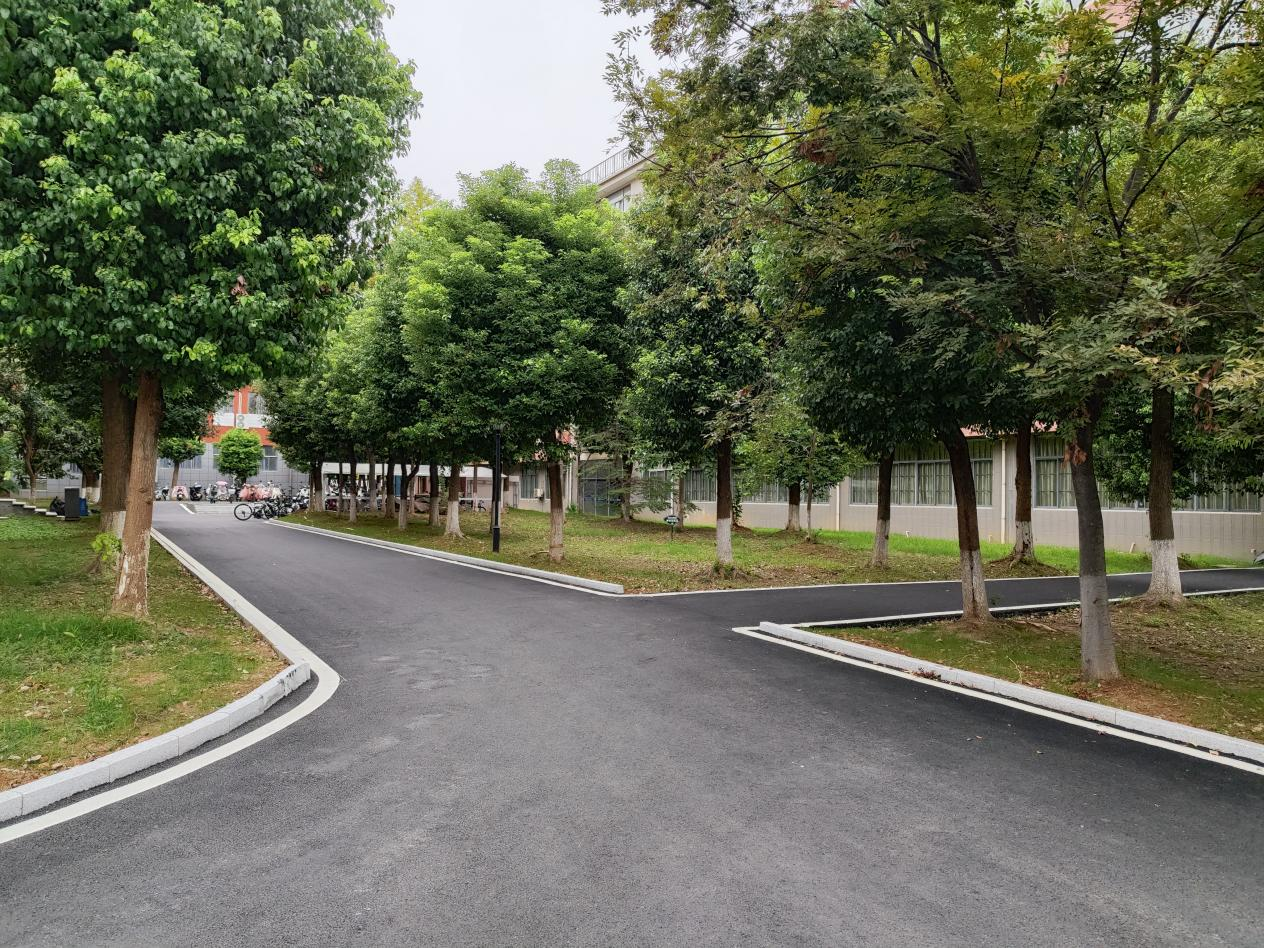 沥青铺就的学校主干道路面整洁美观,为师生日常通勤与教学活动提供安全保障。校园的人行小道也全部进行了硬化美化,道路斜坡上人性化地设计了台阶和坡道,既方便人行,也考虑到电瓶车和自行车的顺利通行。
