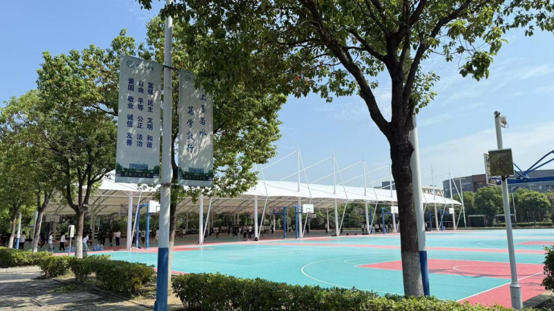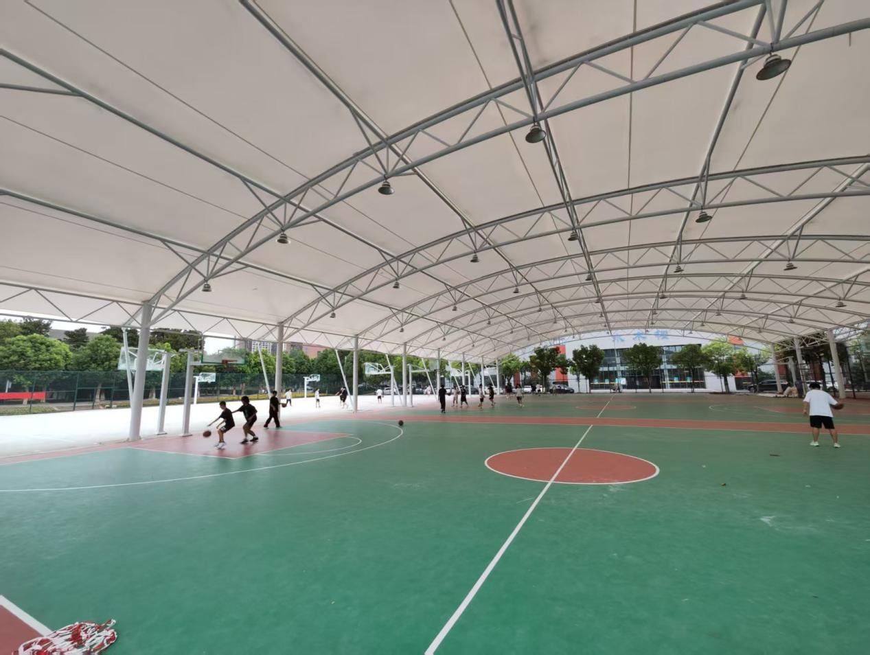 继学校体育馆落成使用后,篮球场进行了翻新,“风雨操场”新装了高大的白色遮阳挡雨棚,成为运动场上一道亮丽的风景线,“风雨无阻的体育课”呈现在眼前。