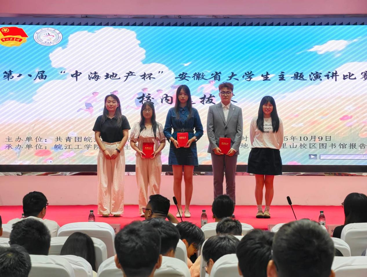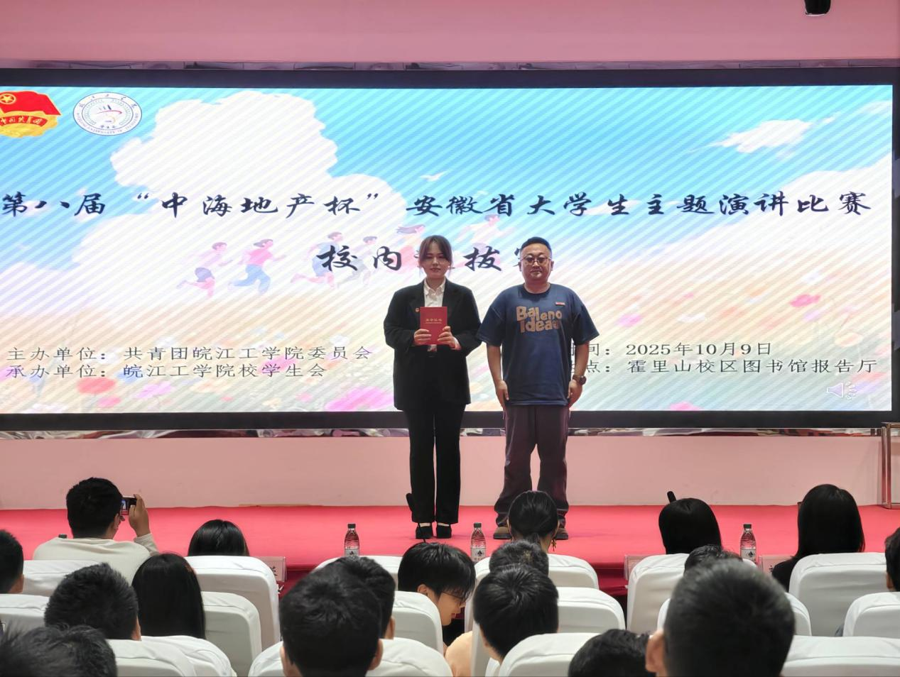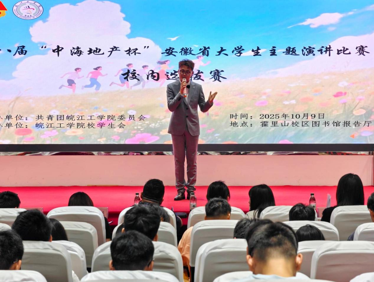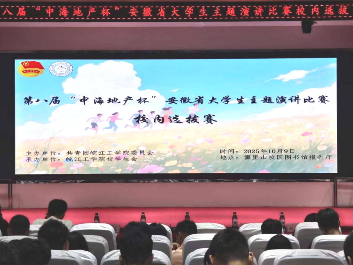 2025年10月9日晚19:00,由AC米兰官方网站校团委主办、校学生会承办的第八届“中海地产杯”安徽省大学生主题演讲比赛校内选拔赛在霍里山校区图书馆报告厅顺利举行。本次比赛以“青春为中国式现代化挺膺担当”为主题,旨在通过演讲的形式,引导广大青年学生坚定理想信念、传承红色基因、弘扬徽州文化、投身社会实践,勇担时代重任。水利工程学院分团委书记陈少博、电信工程学院分团委书记蒋紫姻、计算机与人工智能学院分团委书记尚蓉、机械工程学院分团委书记汪娟、财经学院分团委书记裴维平、艺术设计学院分团委书记刘慧以及校团委组织宣传科副科长翟云霞出席比赛现场。