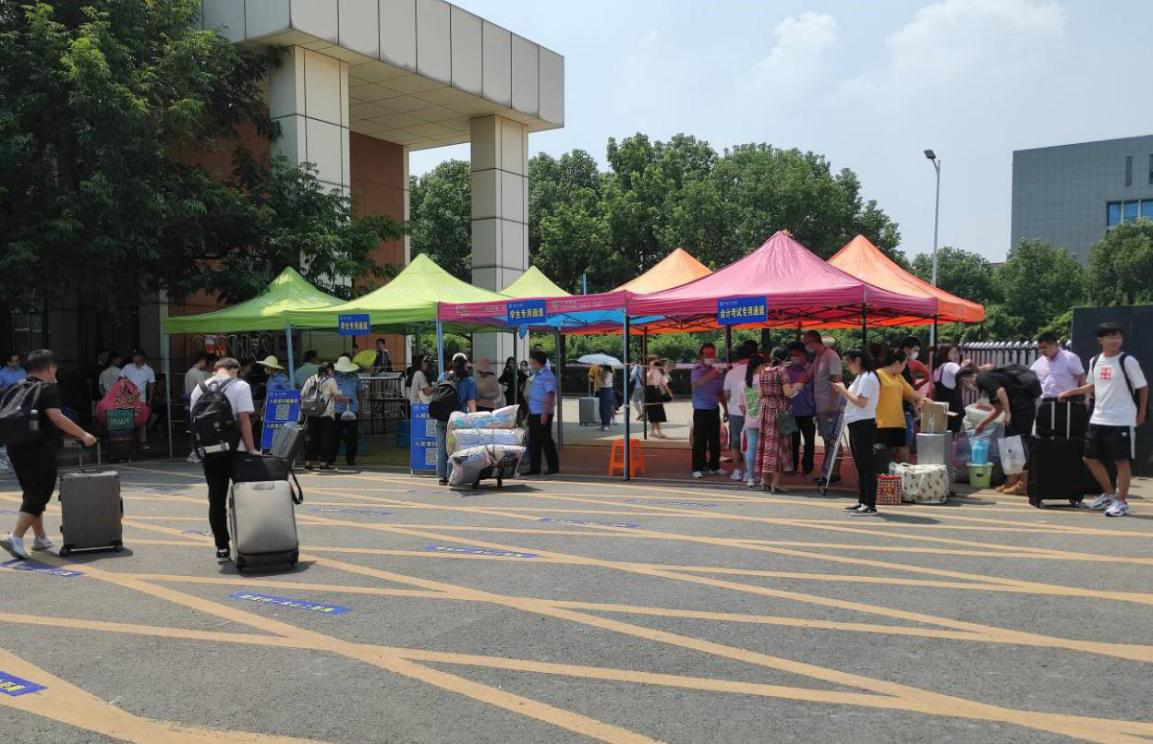 在返校入口处,同学们有序排队,逐一出示健康码、测量体温后进校。学校组织工作人员和学生志愿者现场协调,并设置应急处置点。进校后,在宿舍管理站,同学们在返校名单上签字,测量体温后陆续回到寝室。学校还为每个宿舍提供温度计、洗手液等防疫物资。