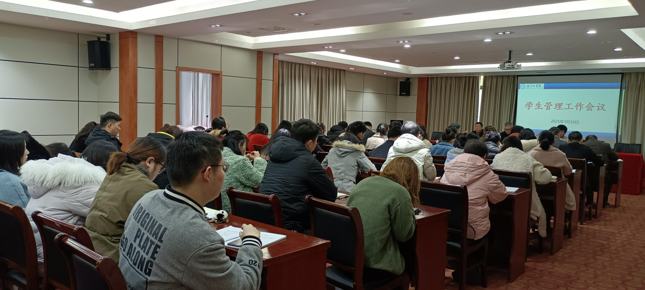 朱洪高指出,2020年是不平凡的一年,学生管理工作经历了大事、要事、急事,全体学生管理工作人员付出了很多心血,推进了学校的稳定发展。今年是“十四五”规划开局之年,又适逢我党百年华诞,学校要准确把握进入新发展阶段、贯彻新发展理念、构建新发展格局对学生工作的新要求,紧紧围绕立德树人根本任务,以人才培养为中心,以思想建设为引领,以学风建设为主线,以文化建设为载体,以组织建设为导向,以队伍建设为保障,以学校“十四五”规划谋开局,做到学校管理质量提升,特色发展优势突出。他强调,学生管理要从以下三个方面做好各项工作: 一是提高站位,高度重视意识形态工作。关注学生所思所想,引导学生理性思考,加强学生正面教育,把社会主义核心价值观渗透到各项学生工作中去。要提高把脉学生思想动态的能力,做好谈心谈话,开好主题班会,走近学生、了解学生、服务学生。二是严格管理,特别是对辅导员队伍和学生干部队伍的管理,提高学生管理队伍水平。要转变工作作风,提高服务意识,以身作则、积极作为,充分发挥模范带头作用,积极发挥立德树人作用。三是增强工作自豪感,对学生成长成才充满信心。抓早抓紧抓细,以全新的工作面貌和充满活力的工作态度投入到新学期学生工作中去,切实做好疫情防控及学生教育和学校管理工作。
