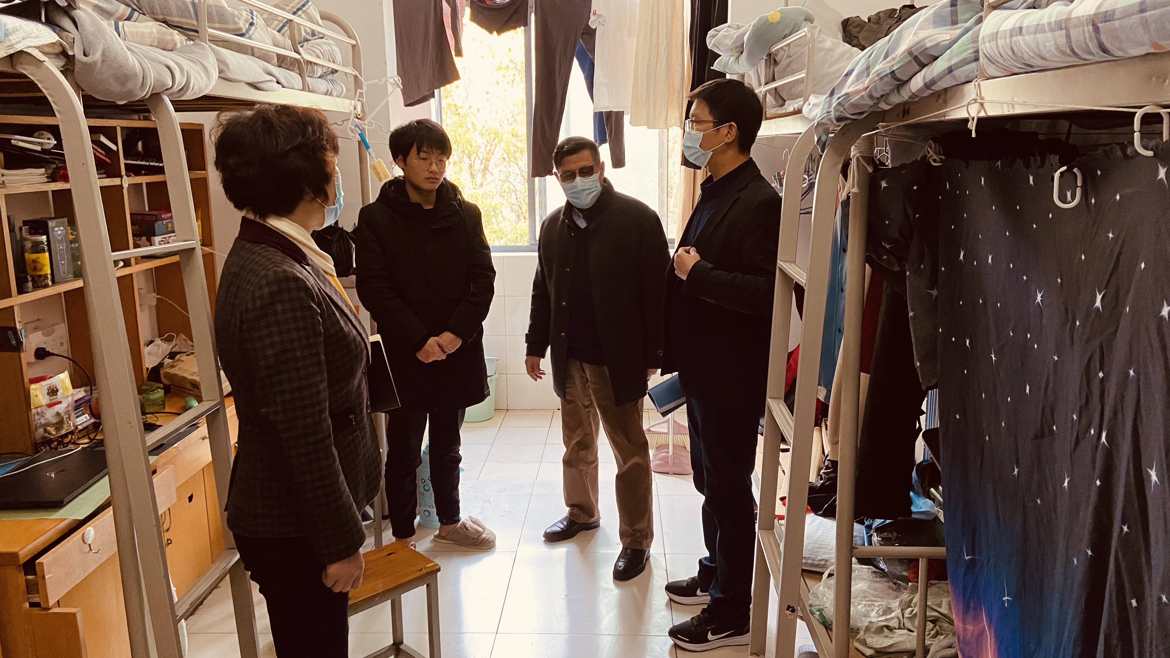 走访过程中,吴继敏一行先后来到9栋和10栋学生宿舍,与同学们亲切交流,详细询问了网课学习和生活情况,了解同学们所遇到的困难和需求。吴继敏叮嘱同学们要切实加强个人防护,保持宿舍卫生、多通风,营造一个安全、健康、舒适的学习和生活环境,他鼓励同学们加强体育锻炼,注意劳逸结合,适时调整心态,遇到困难要跟辅导员和班主任沟通交流。