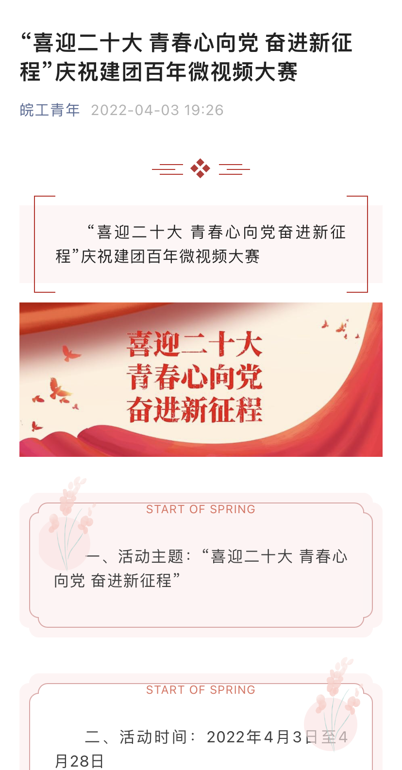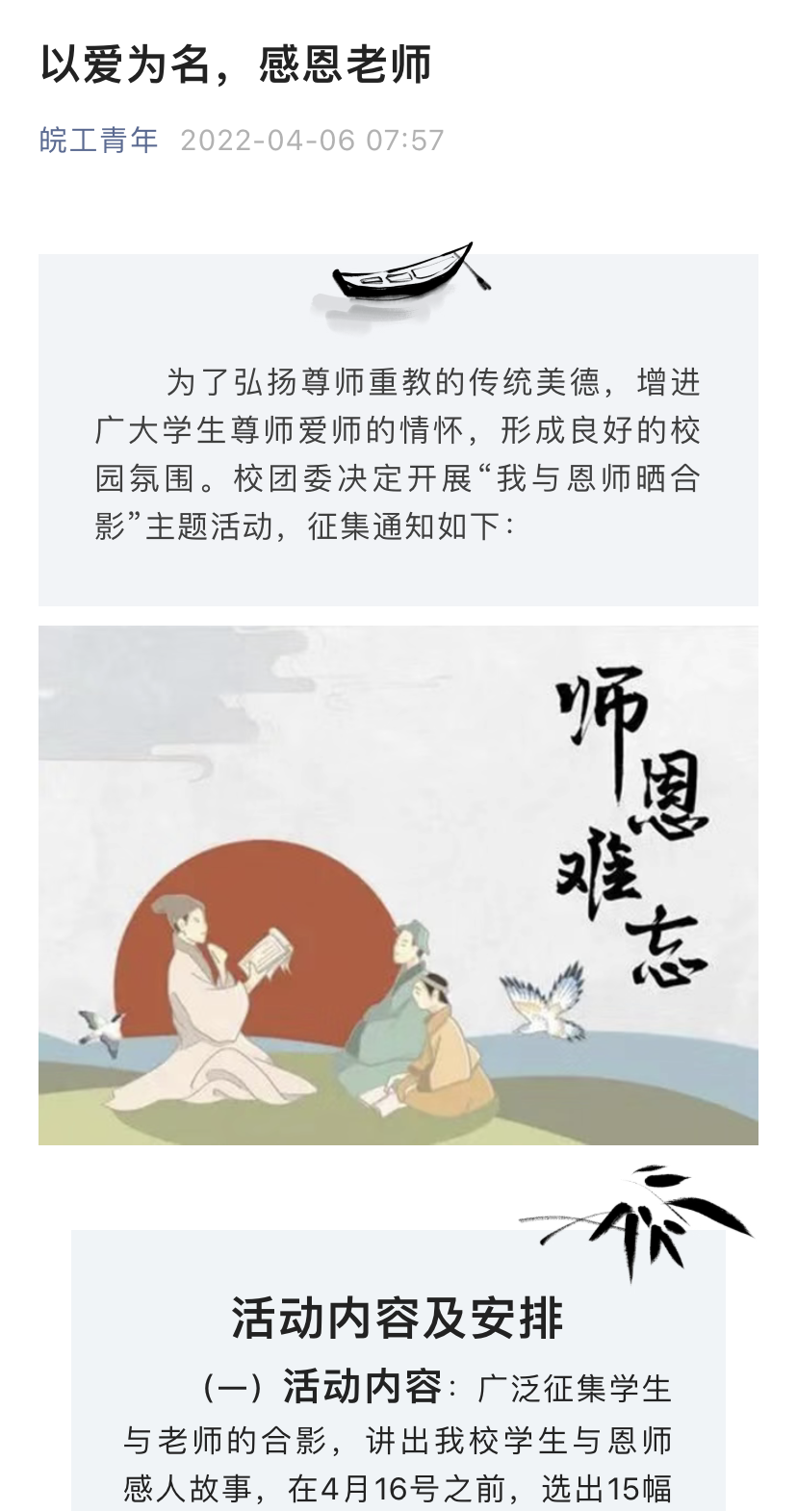 校团委坚守思想宣传主阵地,充分利用各级团属新媒体矩阵主动发声,开展正面宣传和引导,凝青聚力彰显战“疫”路上的青春担当。定期推送抗疫知识、宣传抗疫政策,开展“以爱为名、感恩老师”我与老师合影征集、“献礼建团百年微视频”征集、“喜迎校庆·情系米兰”征文、摄影、视频征集活动等,同时在新媒体平台上同步展示优秀作品。