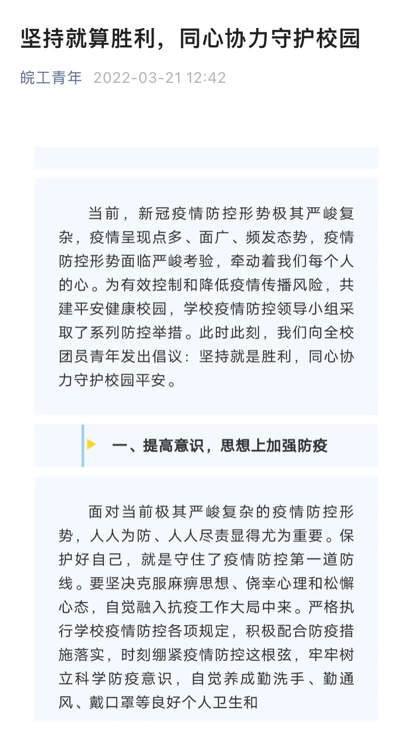 校团委将继续发挥广大团员和基层团组织在疫情防控工作中的生力军和突击队作用,认真履行职责和使命,把“党旗所指就是团旗所向”的行为标准落实到疫情防控的第一线,众志成城、共克时艰,以青春之我守护校园的和谐稳定。