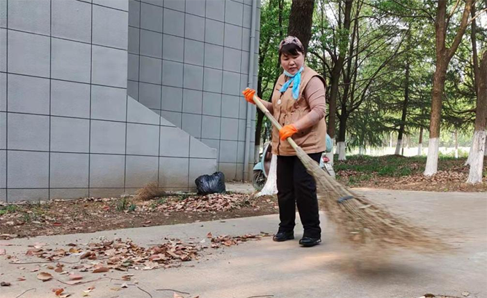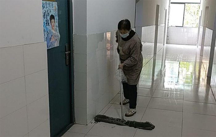 面对肆虐的疫情,没有人内心不恐惧,为了保洁工作,他们不怕脏,不怕累,不怕危险,坚守自己岗位。在校疫情防控期间,在打扫楼道卫生的时候,她时不时就会提醒来往的学生佩戴好口罩,做好个人疫情防范。