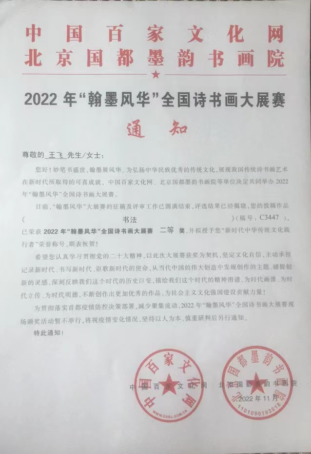 近日,由中国百家网、北京国都墨韵书画院主办的2022年“翰墨风华”全国书画大展赛已经在广大书画爱好者的积极响应和的祝福语中落下帷幕。经过每位参赛者积极的努力和激烈的角逐,提笔挥毫,泼墨落笔,大显身手,各展锋芒,米兰王飞老师经过严格筛选和层层选拔,最终脱颖而出,荣获本次2022年“翰墨风华”全国诗书画大展赛书法展二等奖。
