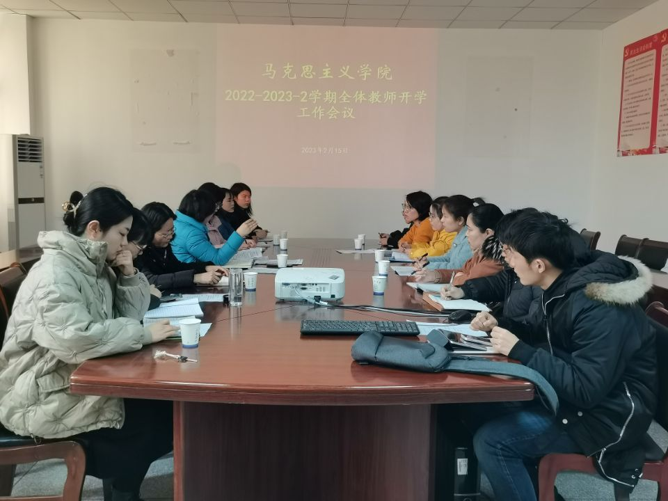 2月15日下午,马克思主义学院在C507会议室召开全体教师开学工作会议,常务副院长刘双、院长助理张春艳、各教研室主任、综合办公室负责人及马院全体任课教师全部参加,会议由刘双主持。