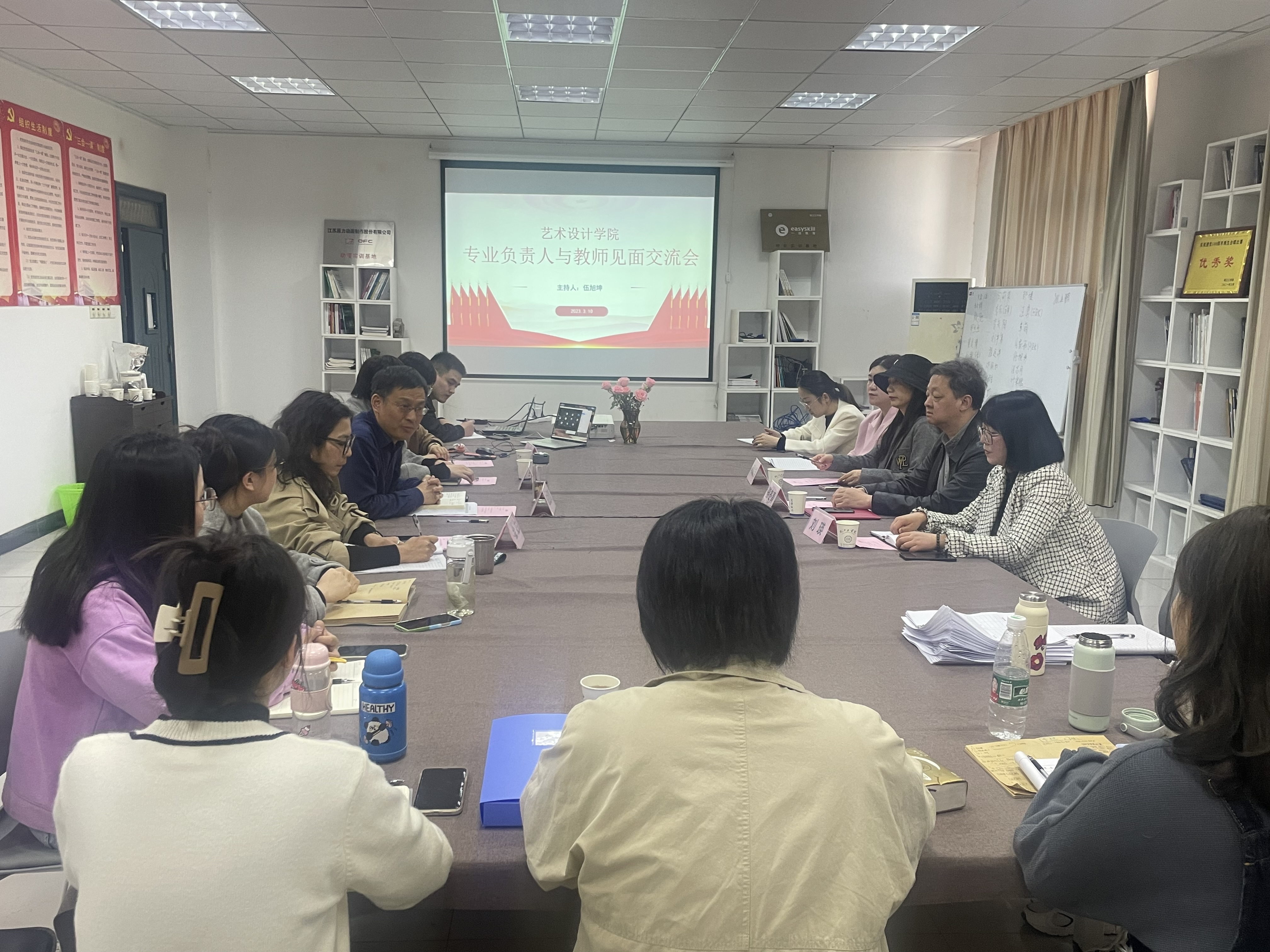 2023年3月10日下午,艺术设计学院专业负责人与教师见面交流会于东教303会议室召开。产品设计专业负责人何灿群、数字媒体艺术专业负责人骆冬青、环境设计专业负责人刘瑛、艺术设计学院院长伍旭坤、党总支书记张亚梅、副院长金花、党总支副书记程楠楠、各专业教研室主任、教师以及辅导员参加了本次见面交流会。会议由院长伍旭坤主持。