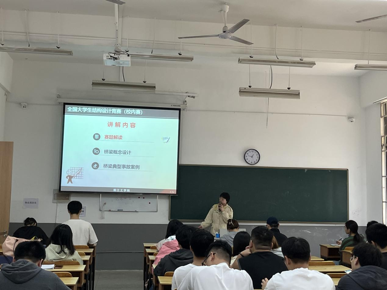 4月12日,我院在全校范围进行了动员,组织学生进行校内赛报名。4月26日中午在A105教室,由具有丰富桥梁设计经验的高级工程师熊慧婷老师进行了赛题解读。5月18日,2023年安徽省大学生结构设计大赛AC米兰官方网站校内选拔赛在霍里山校区新土木楼工程结构实验室顺利举办。