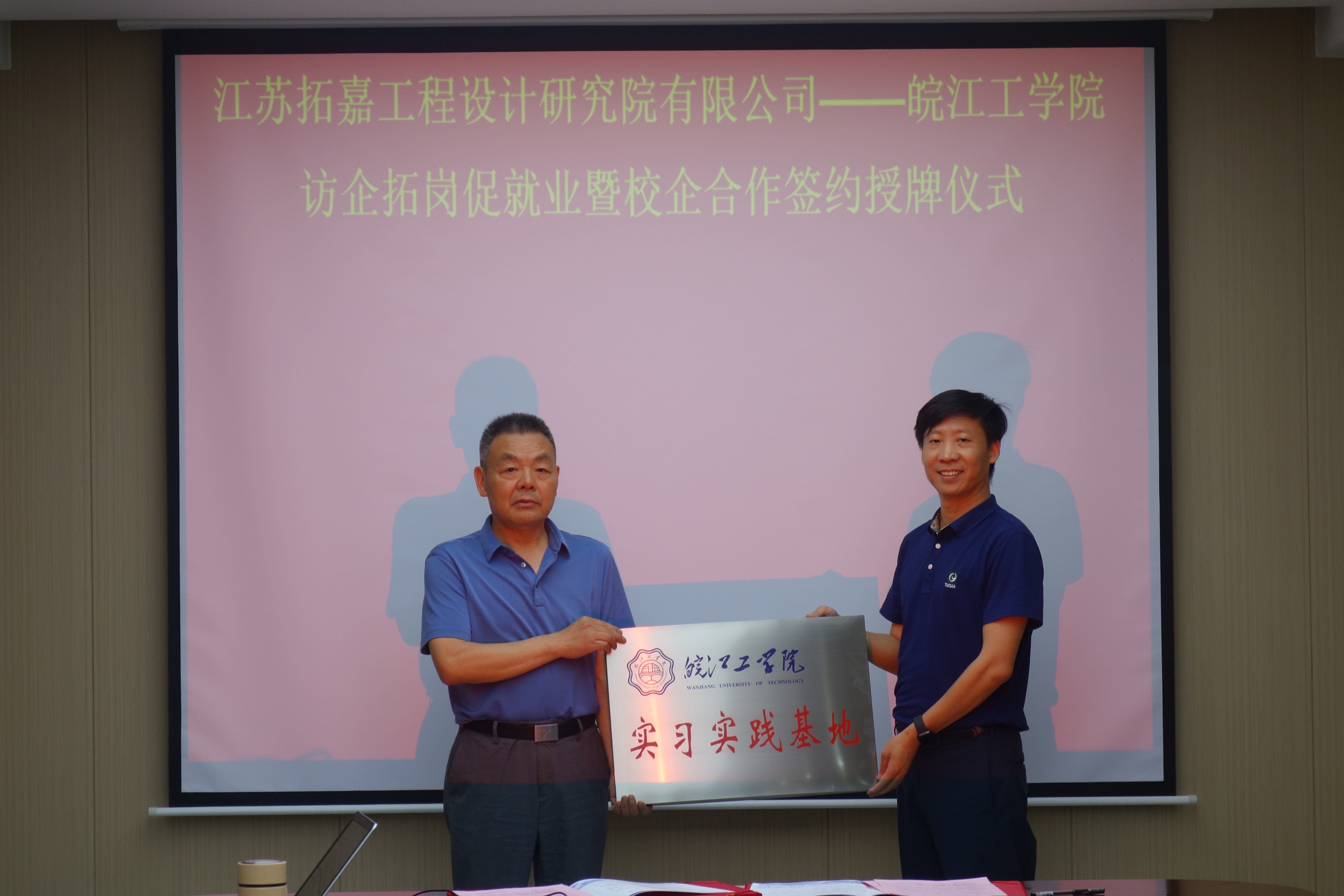 会上唐院长首先对王董事长一行的到来表示热烈欢迎,阐述了当前背景下校企合作的重要意义,并向对方介绍了我院基本情况,对双方就业合作前景做了展望。之后,江苏拓嘉王董事长针对企业概况及业务范围做了详细介绍,并表示企业人才的缺口与我院培养专业人才高度契合,希望学院能够持续输送高质量人才支持企业工作,并对双方后续深化合作表示期待。随后,唐院长与王董事长共同签署了《人才培养与就业基地建设合作协议书》与《实习实践基地建设合作协议书》,双方进行了授牌仪式。