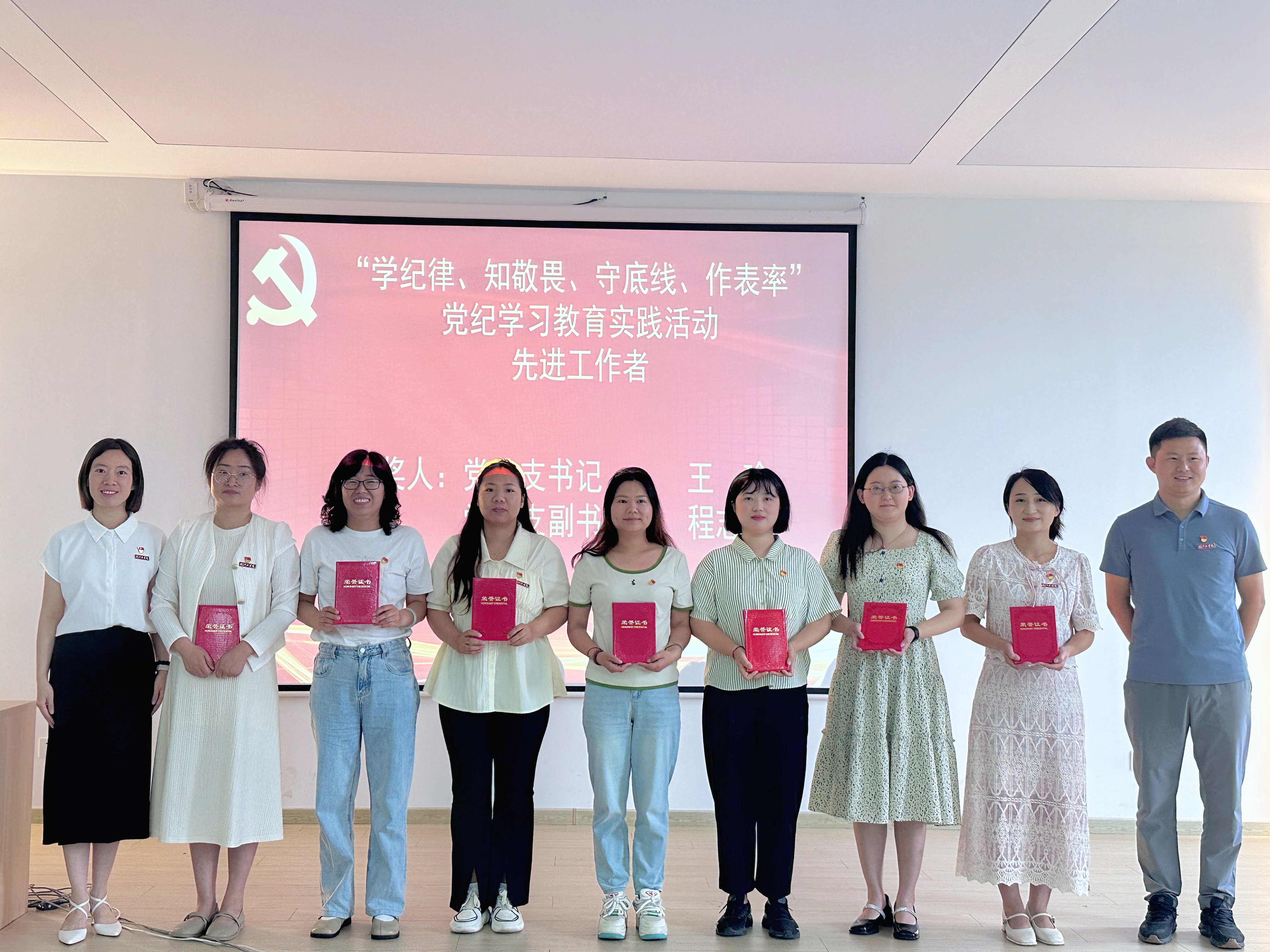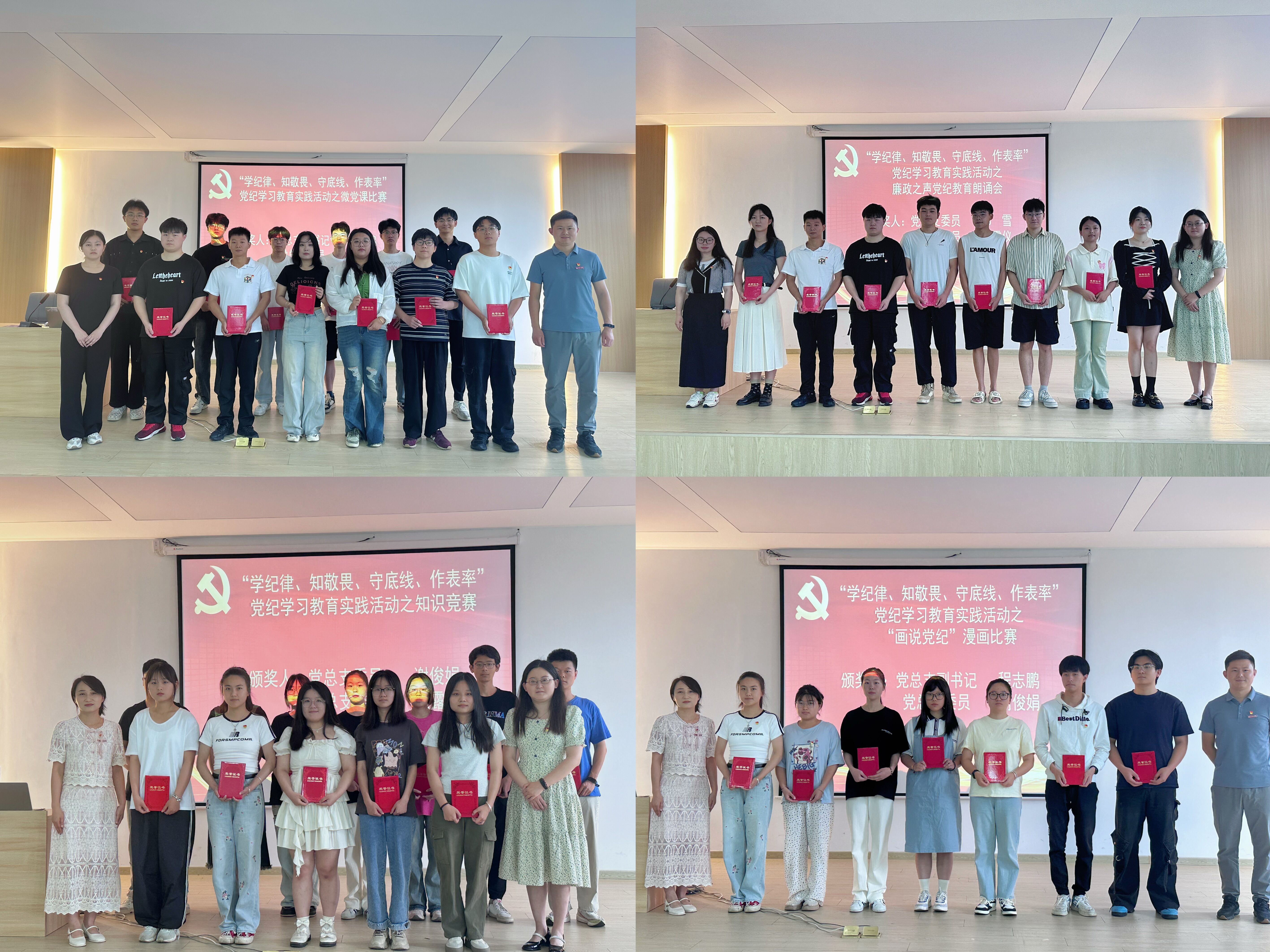 随后举行了“学纪律、知敬畏、守底线、作表率”党纪学习教育实践活动表彰仪式,集中表彰了在党总支主办、各支部承办的党纪学习教育实践活动之微党课比赛、廉政之声党纪教育朗诵会、知识竞赛和“画说党纪”漫画比赛中获奖的参赛选手、优秀作品及涌现出的先进工作者。表彰仪式现场,党总支委员会成员为获奖集体及个人依次颁奖并合影留念。