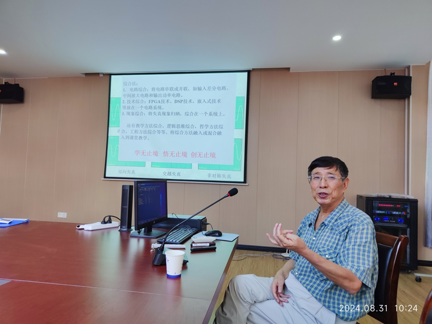 2024年8月31日,电信工程学院邀请北京交通大学博士生导师、全国大学生电子设计竞赛专家、北京大学生电子电路竞赛组委会委员、专家组成员、北京市电子技术学会副理事长侯建军教授来校做主题为《如何提高教师的教学能力》的专题讲座。讲座由电信工程学院院长乔晓华主持,电信工程学院全体教师参加了此次讲座。侯教授结合自己多年科研经验和教学经验,从工程能力、辩证思维以及教学方法三个方面进行深入剖析,为全院教师提升教学能力提供了宝贵经验。