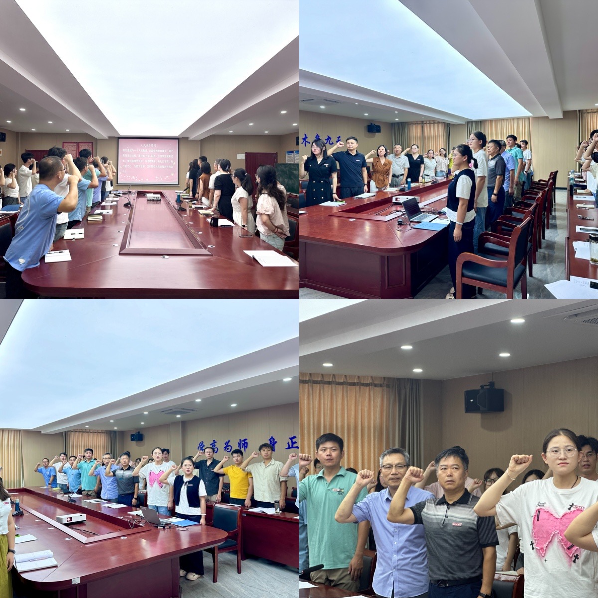 为进一步加强师德师风建设,夯实教师从教之基,明确教师使命与担当,凝聚奋进力量,教师节当天,学院隆重举行了2024年教师集体宣誓活动,学院领导班子成员、银龄教师代表、优秀骨干教师代表和全体新进年轻教师在党总支书记王瑜的带领下进行了庄严的宣誓仪式。大家高举右手,宣读人民教师誓词,铮铮誓言响彻会场,激励和鞭策着全体教师不忘教育初心,进一步增强了教师们的职业荣誉感和使命感。