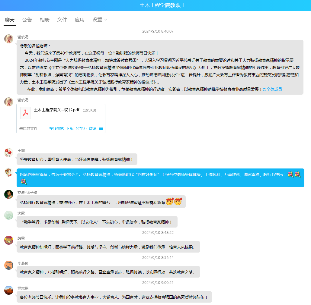 为大力弘扬教育家精神,展现新时代教师风采,增强我院教师团队的凝聚力,在第40个教师节来临之际,土木工程学院广泛开展庆祝2024年教师节系列活动,以多种方式为学院全体教师送上节日的祝福与问候。