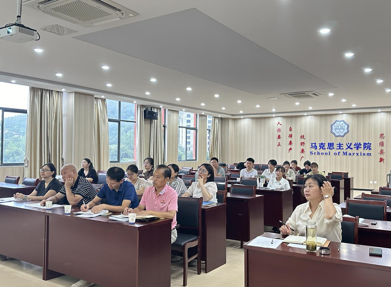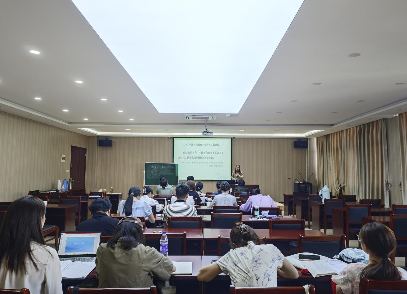 在新中国成立75周年来临之际,为推进教师学习习近平新时代中国特色社会主义思想,充分发挥思政课程立德树人的关键作用。9月10日至9月12日,马克思主义学院分三场开展“喜迎建国75周年”讲课竞赛。安徽工业大学马克思主义学院夏庆波教授,安徽工业大学学术委员会副主任阮超群教授,市委党校沈洁副教授,银龄专家王红梅教授,靳玉琼副教授,总支书记、常务副院长刘双,副院长胡耀东,及各教研室主任担任评委,马院全体教师参加比赛。