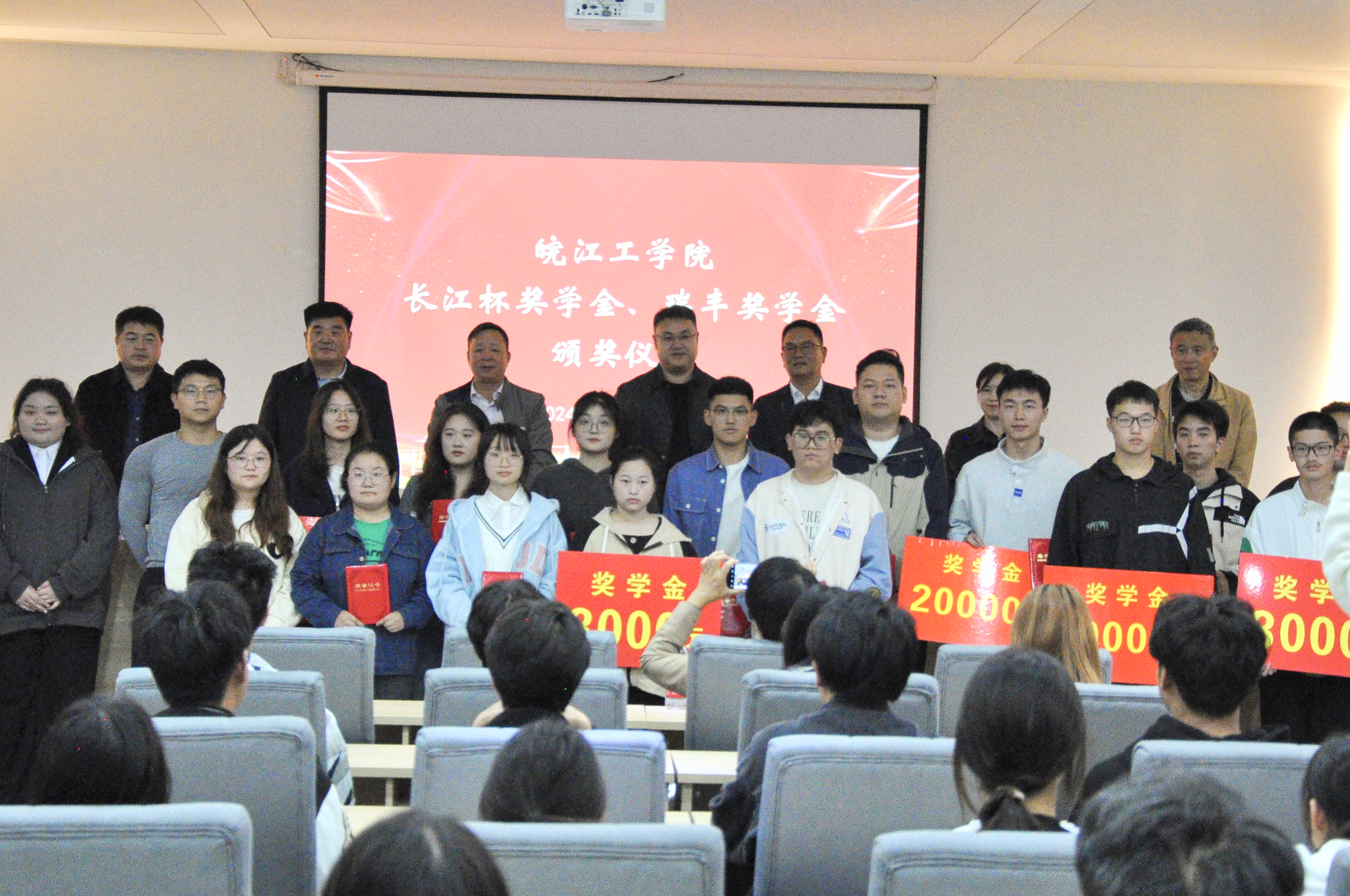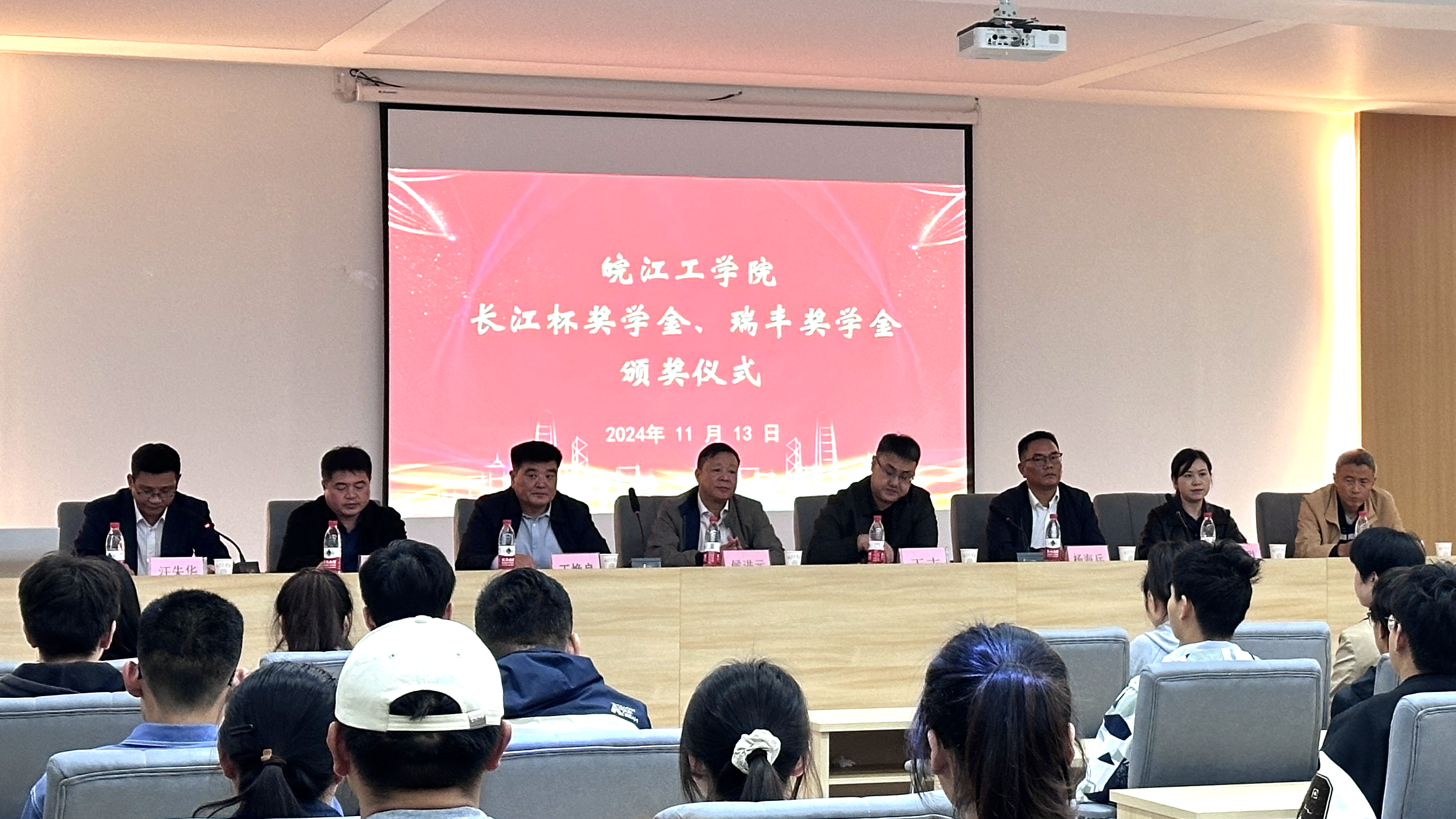 11月13日下午15:30,米兰在水木楼楼西301会议室隆重举行了2024-2025学年“长江杯奖学金”和“瑞丰奖学金”颁奖典礼。安徽省长江河道工程有限责任公司董事长杨海兵、人力资源部部长宋小甜和安徽瑞丰工程科技集团有限公司董事长王焕良、副总经理吴玉凯、财务总监孙鲜明,米兰副校长侯进元、副校长王志,水利工程学院党总支书记李冠华,学工部常务副部长汪朱华出席此次仪式。颁奖仪式由汪朱华主持。“长江杯奖学金”和“瑞丰奖学金”分别由两家企业出资设立。