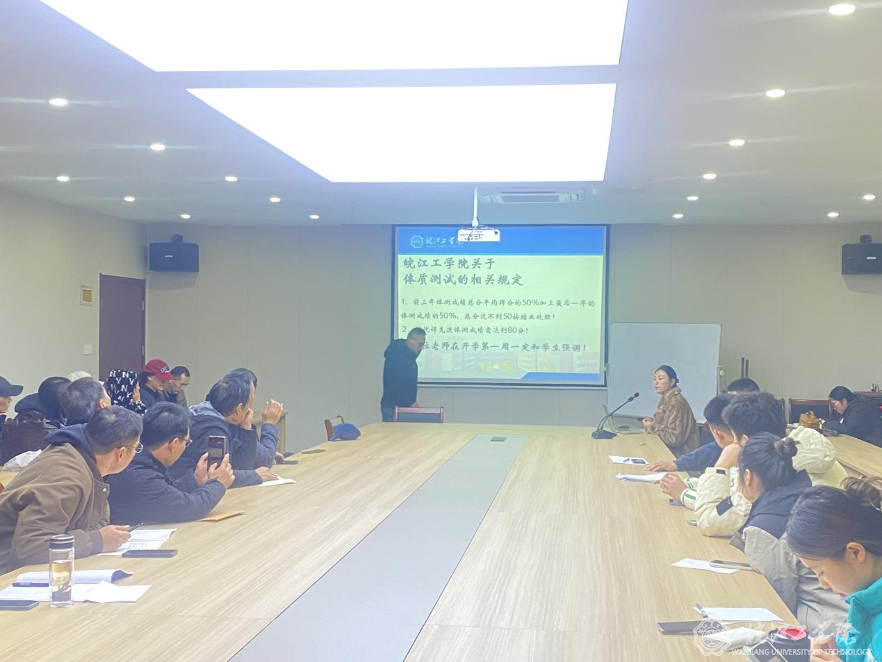 首先,孔祥龙主任就本学期米兰体育教师上课情况发言,他指出,在上课内容上一定要根据教案中的内容和时间严格实施;在第一节课上要做好引导课,确保把安全问题贯彻透彻、考试结构阐述清晰、课堂体测重要性落实到位;在课堂考勤问题上一定要严格把关学生情况等等。会上,孔主任对米兰体育教师提出了一定的要求,希望各位能够再接再厉做好体育工作。
