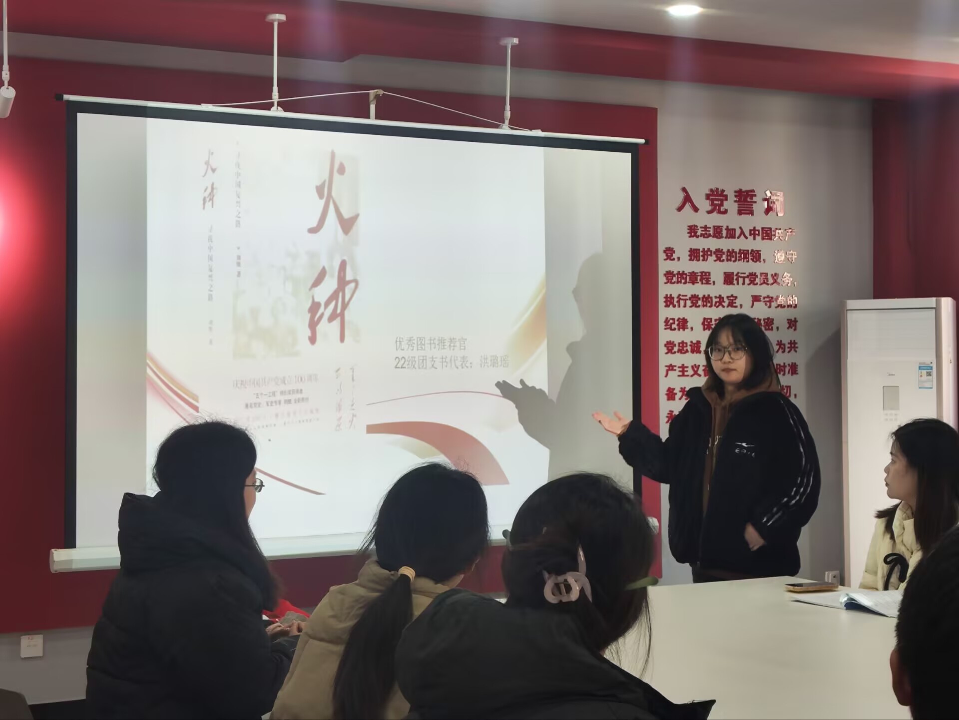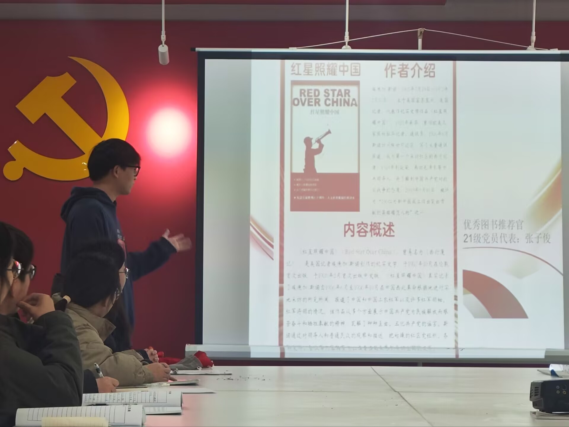 21 级党员代表张子俊作为图书推荐官介绍了《红星照耀中国》,以生动讲述再现革命先辈英勇事迹与崇高精神。22 级团支书代表洪璐瑶推荐《火种》,沉稳阐述共产党从萌芽到壮大的伟大历程。23 级团学干部代表孙思仪推荐《可爱的中国》,以深情剖析传递爱国深情与美好憧憬。