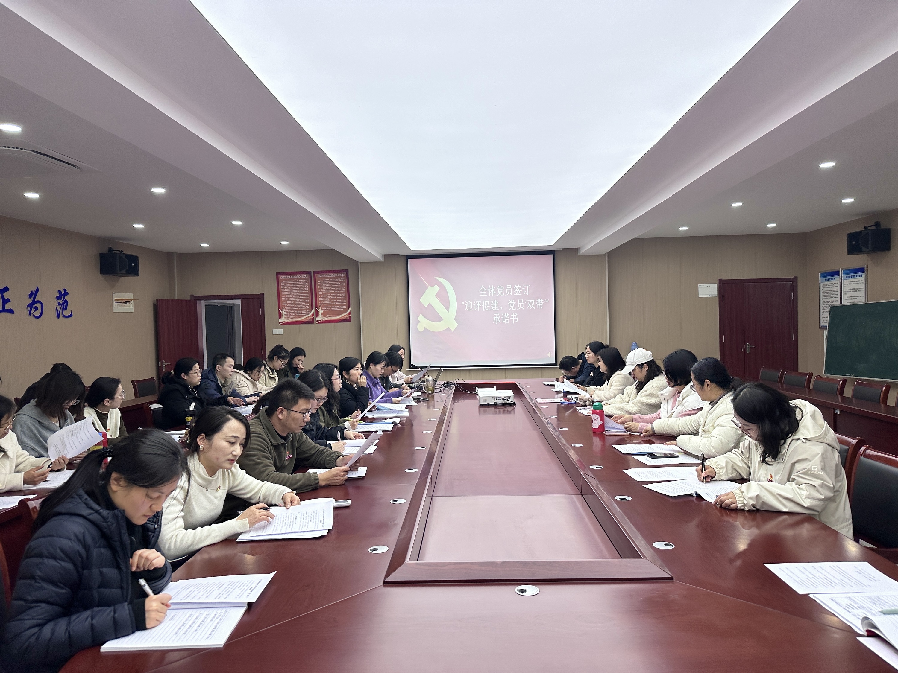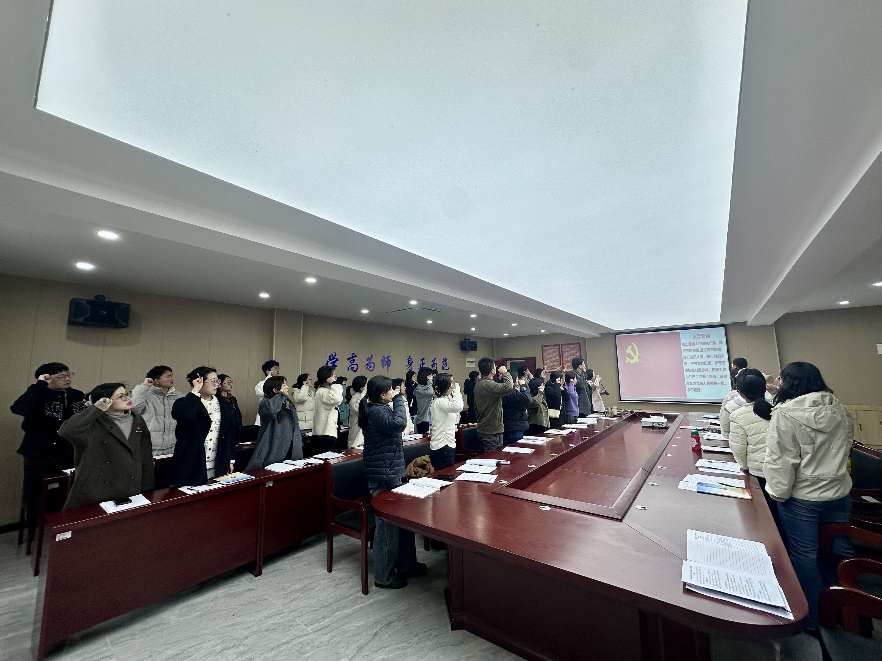 随后,全体党员面向党旗、高举右手,重温入党誓词,并签订了“迎评促建、党员‘双带’”承诺书,承诺把思想和行动统一到学校决战决胜本科教学工作合格评估冲刺的安排和部署中,高标准落实学校本科教学工作合格评估的各项要求,为学校高质量通过本科教学工作合格评估贡献力量。