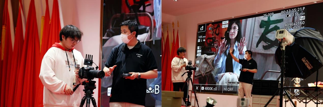 “构图是画面的骨架,光影是影像的灵魂。”邵老师通过对比不同场景的拍摄效果,生动展示了如何利用自然光与人造光塑造画面层次感,并分享了快速调整曝光参数的实用技巧。同时,他还邀请了两位现场的同学们亲身参与了设备的调试与拍摄,实践操作也都令同学们受益匪浅。本次讲座特别设置设备体验环节,现场陈列佳能C70电影机、爱图仕灯光套装、大疆航拍无人机等十余套行业级设备,供学生亲手操作。在讲师与助教的指导下,同学们分组进行实战演练,从调整光圈快门到布光构图,从静态拍摄到动态跟焦,沉浸式感受专业影视创作的流程与细节。