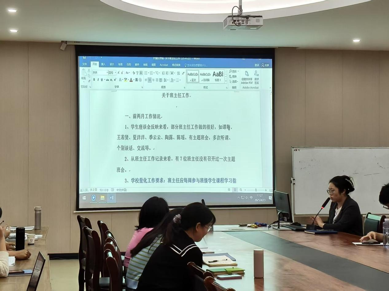 韦晨珺娃首先对前两个月班主任工作情况以及学生座谈会反映的问题进行了通报,并带领大家再次重温了班主任工作量化要求。韦书记指出,从目前工作情况来看,我院班主任工作还不容乐观,部分班主任在思想认识上还有待提高,在工作力度上还有待加强。