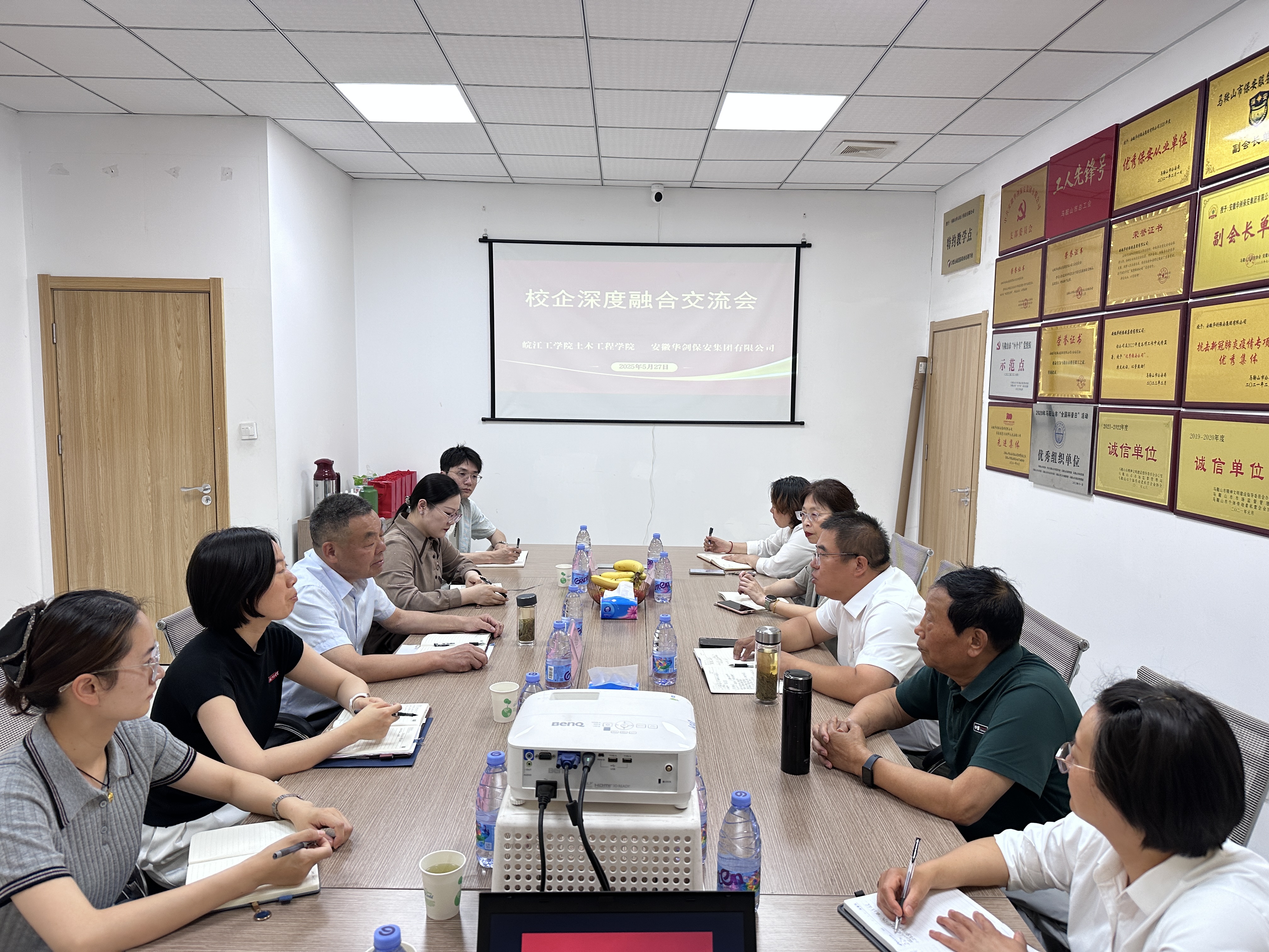 为进一步推进校企协同育人机制建设,深化产教融合,提高应用型人才培养质量,5月27日下午,土木工程学院与安徽华剑保安集团有限公司举行校企合作座谈会暨实习基地签约授牌仪式,并新聘兼职教授。马鞍山市消防协会会长、安徽省消防协会工作站主任刘志成,安徽华剑保安集团有限公司董事长史劲、人事部经理李义姣、行政部主任胡映霞,安徽工业大学商学院教授刘芳,土木工程学院院长唐德高、党总支书记王瑜、副院长李杰如、安全工程教研室主任李平等参加。