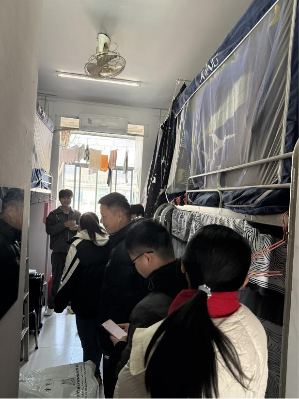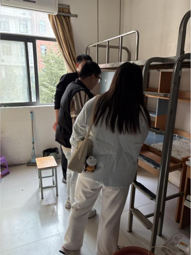 2月16日,全体辅导员深入学生宿舍走访,看望正在返校的学生,对宿舍内学生基本生活设施设备进行检查并对安全隐患进行排查,并给正在返校学生普及安全知识。