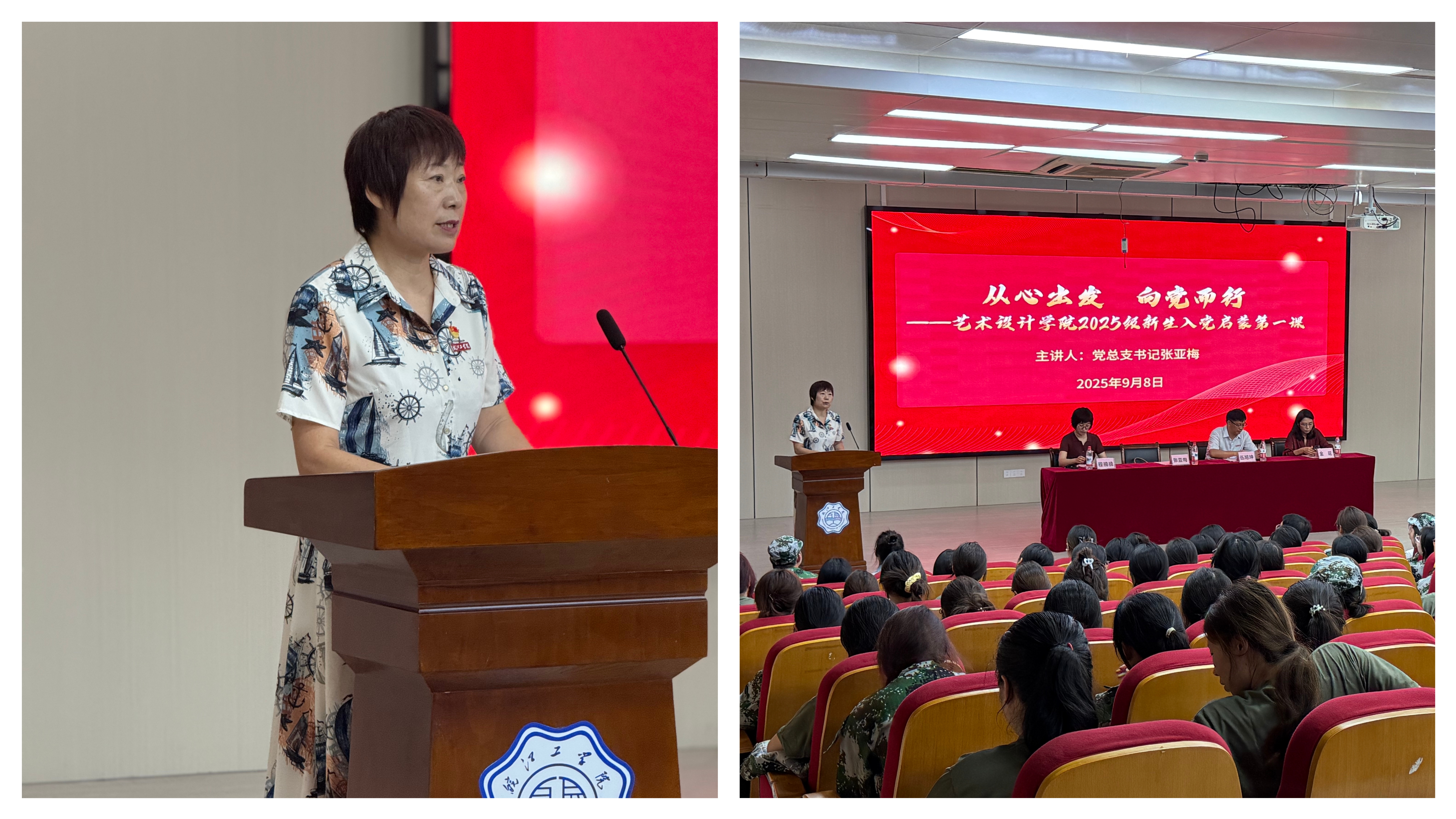 党总支书记张亚梅以《从心出发 向党而行》为题,为新生带来入党启蒙第一课。她结合 “四个一” 入党启蒙教育模式,从党的光辉历程、青年使命担当、入党基本程序等方面展开宣讲,鼓励新生“扣好人生第一粒扣子”,将个人理想融入国家发展大局。她特别强调:“艺术设计不仅是技术的传承,更是价值观的传递。希望同学们以艺术之美传播红色文化,让青春在党和人民最需要的地方绽放绚丽之花。”