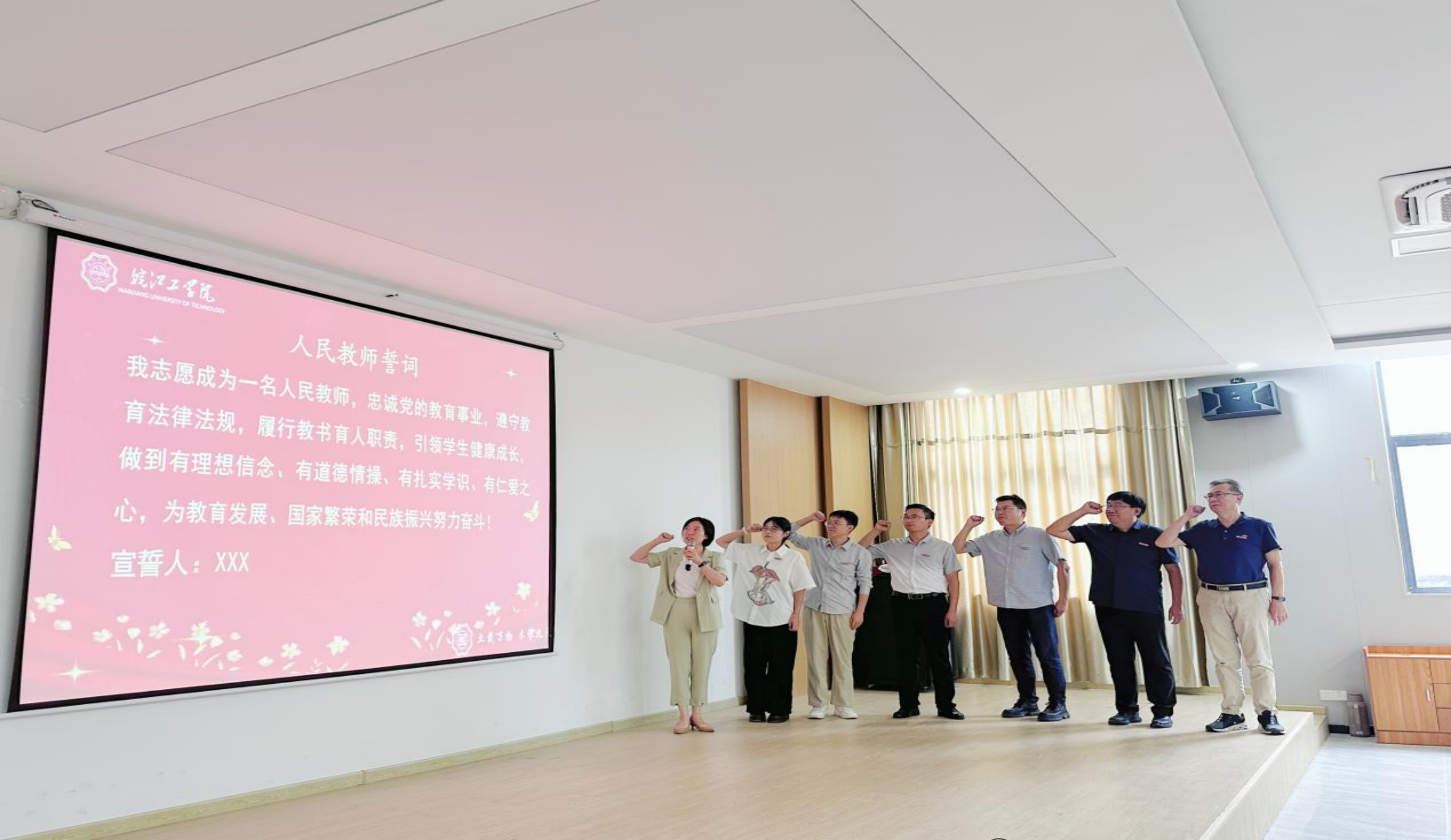 活动在庄严而温馨的氛围中拉开帷幕。新入职教师身着正装,整齐列队上台。在党总支书记王瑜的带领下,他们高举右拳,郑重宣读《人民教师誓词》:“我志愿成为一名人民教师,忠诚党的教育事业…… 为培养德智体美劳全面发展的社会主义建设者和接班人而努力奋斗!”铿锵有力的誓言,彰显了他们投身教育事业的坚定信念与崇高追求。