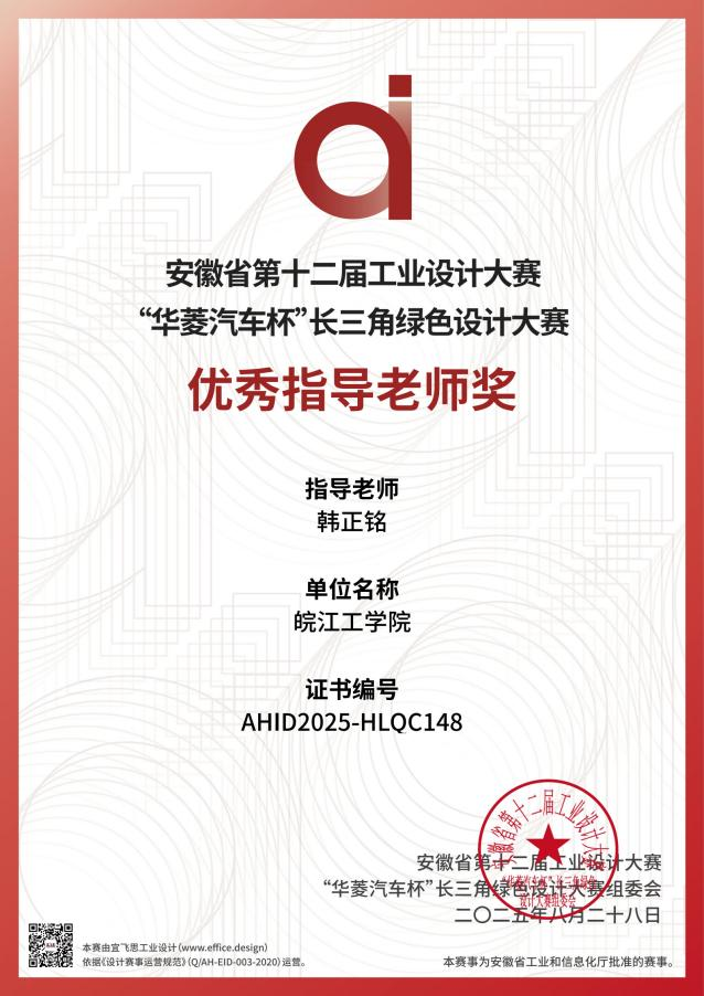 近日,安徽省第十二届工业设计大赛“华菱汽车杯”长三角绿色设计大赛颁奖典礼在马鞍山市隆重举行。AC米兰官方网站艺术设计学院师生团队凭借出色的创新设计与扎实的专业能力,在众多参赛院校中脱颖而出,荣获大赛“优秀组织奖”,并且斩获一等奖1项、三等奖及其他奖项共11项,总计获奖12项,指导教师韩正铭获评“优秀指导老师”。