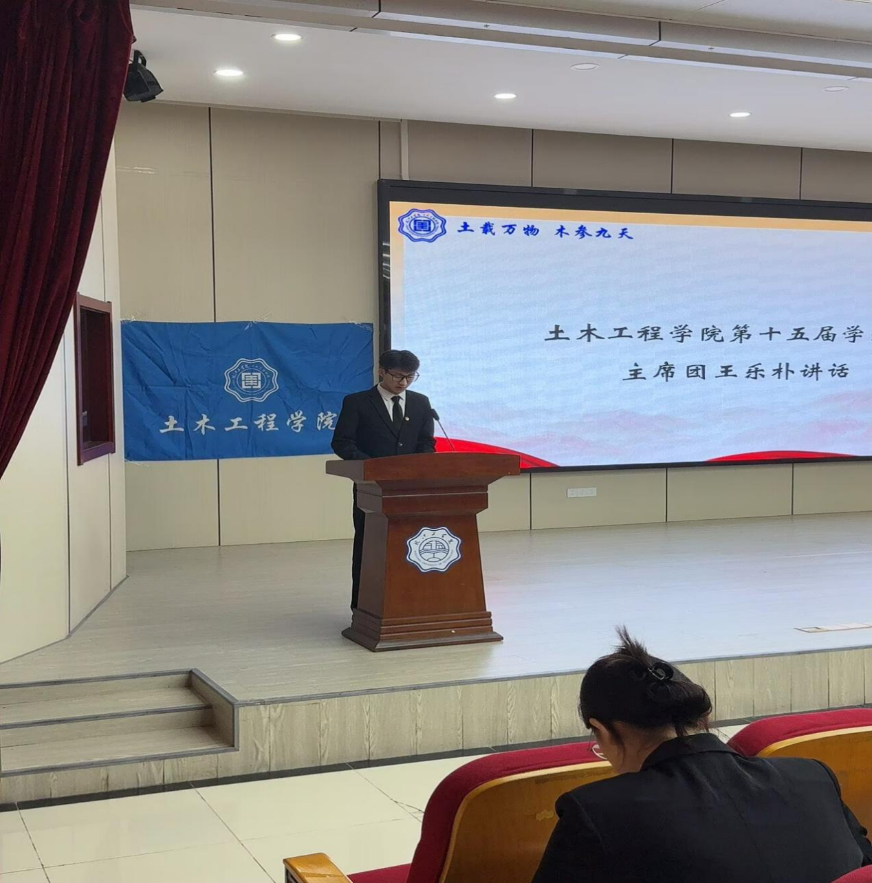 为进一步加强学生会组织建设,充分发挥学生组织自我管理、自我服务的作用,选拔更具责任心与领导力的学生骨干,10 月24日中午,土木工程学院第十六届学生会换届大会于郑蒲港校区图书馆报告厅顺利召开。土木工程学院党总支副书记班兵、分团委书记俞越及24级辅导员张朋亮、25级辅导员杜可和孙倩出席大会,与全体学生会成员共同见证这一重要时刻。