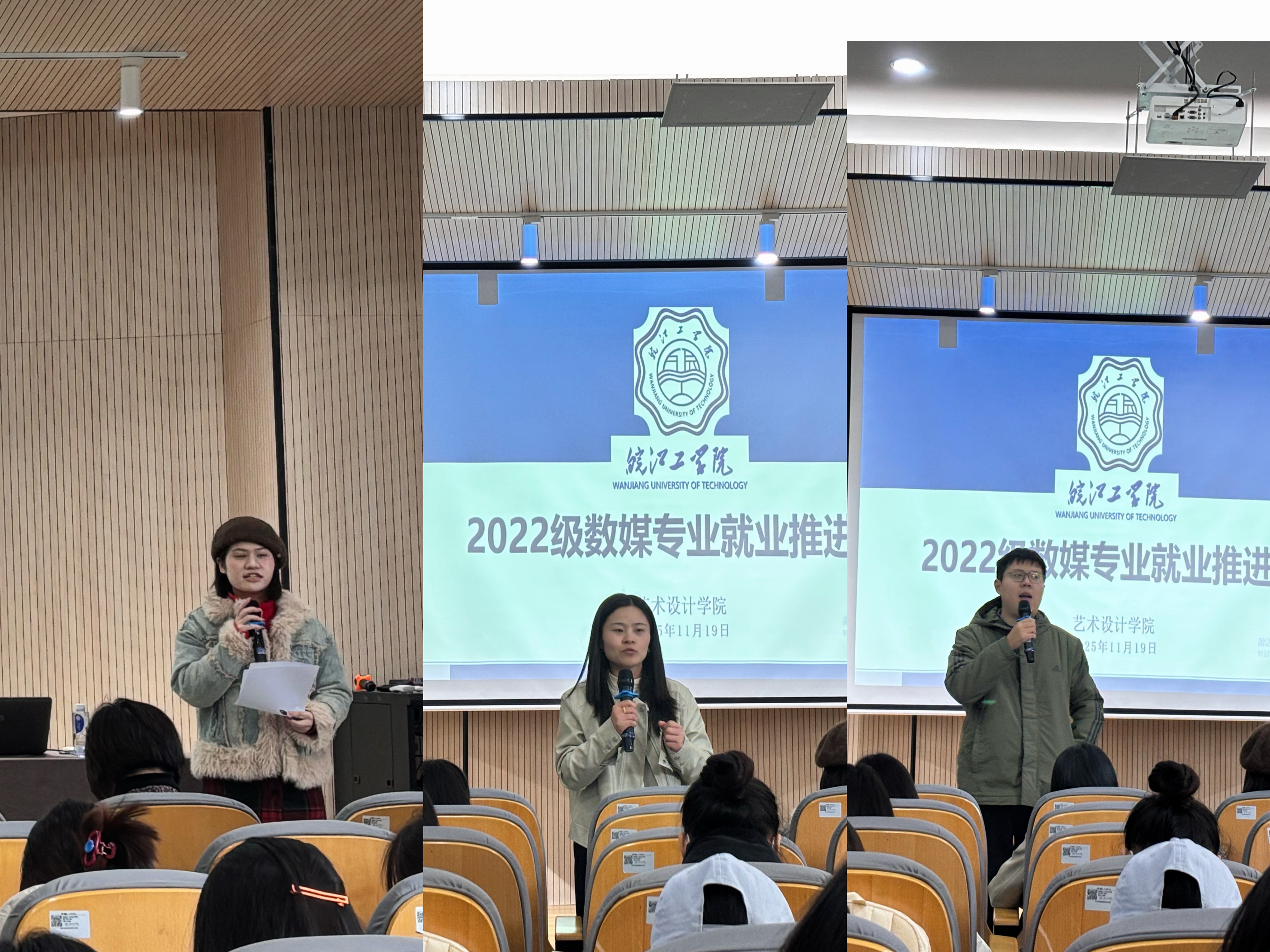 为扎实推进2026届毕业生就业工作,提升学生就业竞争力,11月19日,艺术设计学院在洪雅楼105报告厅组织召开2022级数字媒体艺术专业就业推进会。艺术设计学院院长伍旭坤、党总支书记张亚梅、副院长金花、副书记程楠楠、数媒专业教研室主任、副主任及22级辅导员共同参会,为即将步入就业岗位的学子提供精准就业指导。